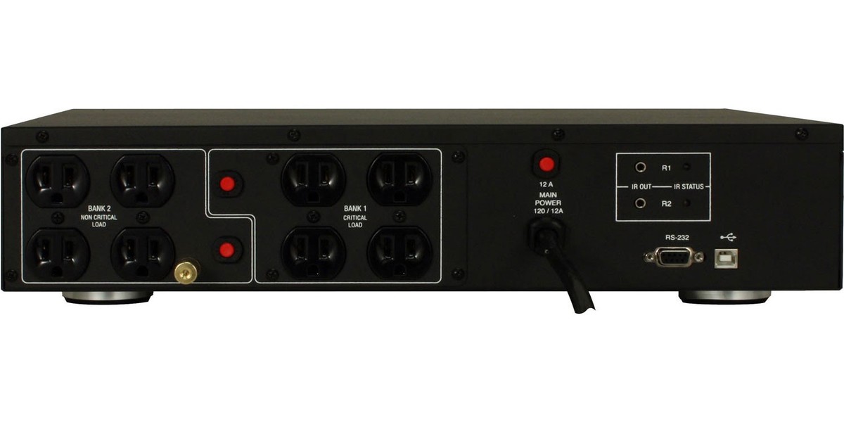The F1000-UPS provides open source RS-232 control over two independent AC outlet banks, with a wide range of control features to interface with an existing automation solution. The dual programmable IR control allows the unit to send a shutdown command to remote components. With LED status indicators that warn you when the voltage is outside of nominal range or when protection has been compromised.
