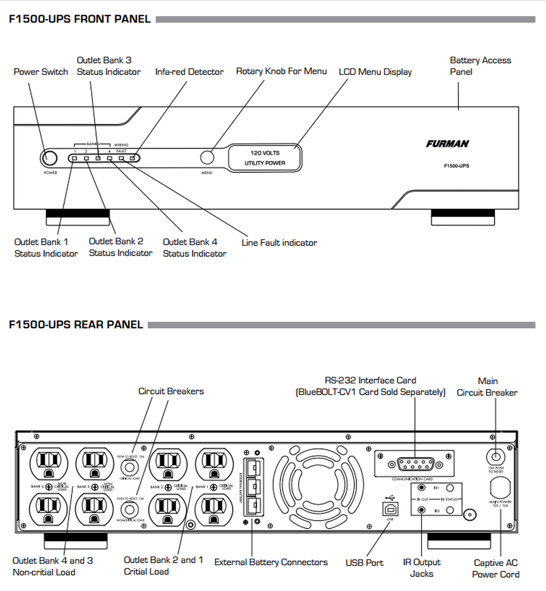 The Furman F1500-UPS 1500VA Rack Mount Uninterruptible Power Supply with battery backup/power conditioner, SMP, RS-232, USB Interface. This 8 outlet UPS is designed for audio/video professionals and home theater aficionados. Constructed with many revolutionary technologies (SMP, EVS, LiFT...), this rack mount will provide uncompromised AC protection and purification for years to come.