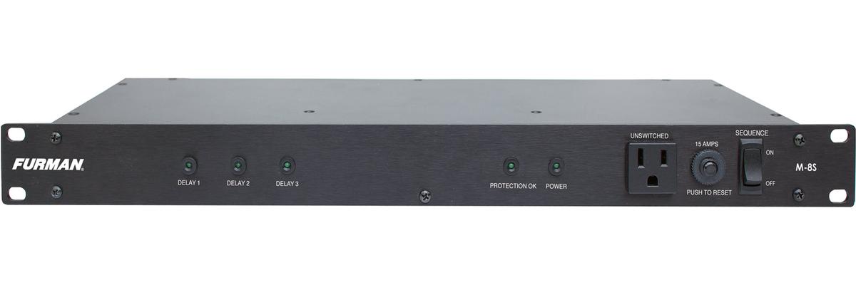 This M-8S 15A Standard Power Conditioner with Power Sequencing from Furman has nine outlets; eight on the rear panel and one on the front panel for the users convenience. Each of the eight outlets power up in sequence to protect all of the users equipment from up to a 15-amp load. This power conditioner is a cost-effective, ideal AC power solution that can be mounted on any rack mount system where the user has need for power sequencing. It includes three delayed outlet banks, each with two outlets, it also includes two unswitched outlets.