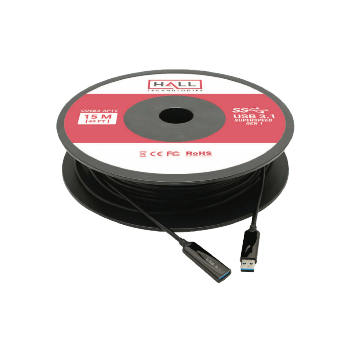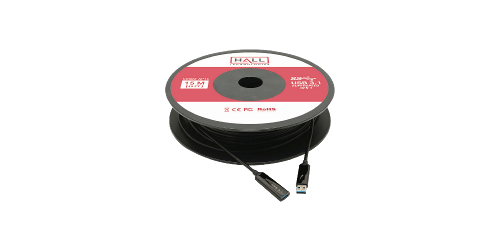 The CUSB3-AP* cables are members of Hall Research's Javelin family of active optical video and USB cables. The CUSB3-AP* cables are used to extend USB 3.0 (USB 3.1 Gen1) Super-Speed signals at data rates of up to 5 Gbps. They support transparent extension of USB 3.1 Gen1 and are compatible with all USB 3.0 devices including 4K USB 3.0 cameras and USB 3.0 memory devices. They are offered at standard lengths of 15, 30, and 50 meters (50, 100 and 164 ft).The cables are light-weight and are constructed using a hybrid of fiber and copper. Fiber optics offer high immunity to EMI and RFI noise for trouble free operation. The cable uses minimal power and does not require any additional power supply. The USB host connection provides 5v power for operation and the cable sends 5v via its copper wires to the remote (device) end. The cables are constructed using Plenum (CMP) Rated jacket material to ensure compliance with modern building codes. The small cable ends can be easily pulled through most conduits (a pulling sock is recommended).CUSB3-AP* cables are compatible with virtually all USB 3.0 and 3.1 Gen1 devices, and are a perfect solution for extending 4K videoconferencing cameras, video capture, docking stations, and other high-speed data communications.