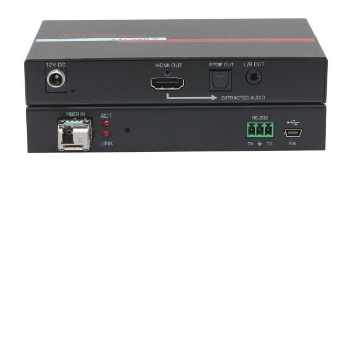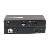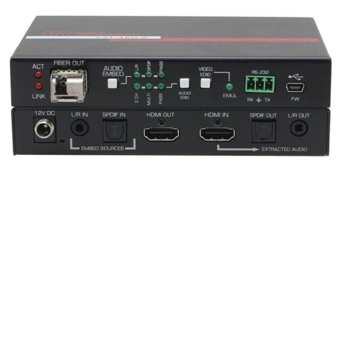 The system provides advanced capabilities such as embedding and de-embedding audio, 4K UHD video (4:4:4 with HDR), HDCP 2.0, bidirectional RS-232 and EDID management.The FXT-460-S Sender provides an HDMI input with a corresponding HDMI loop output. The audio component of the HDMI input is extracted and available as both analog (L/R) and Digital SPDIF (TOSLINK) on corresponding connectors.The audio that is embedded in the extended HDMI to the remote Receiver can be selected by the user to be one of the following: