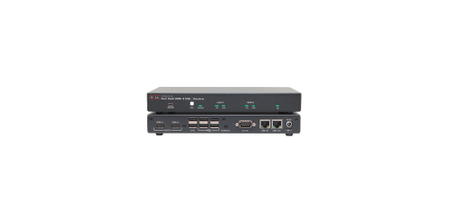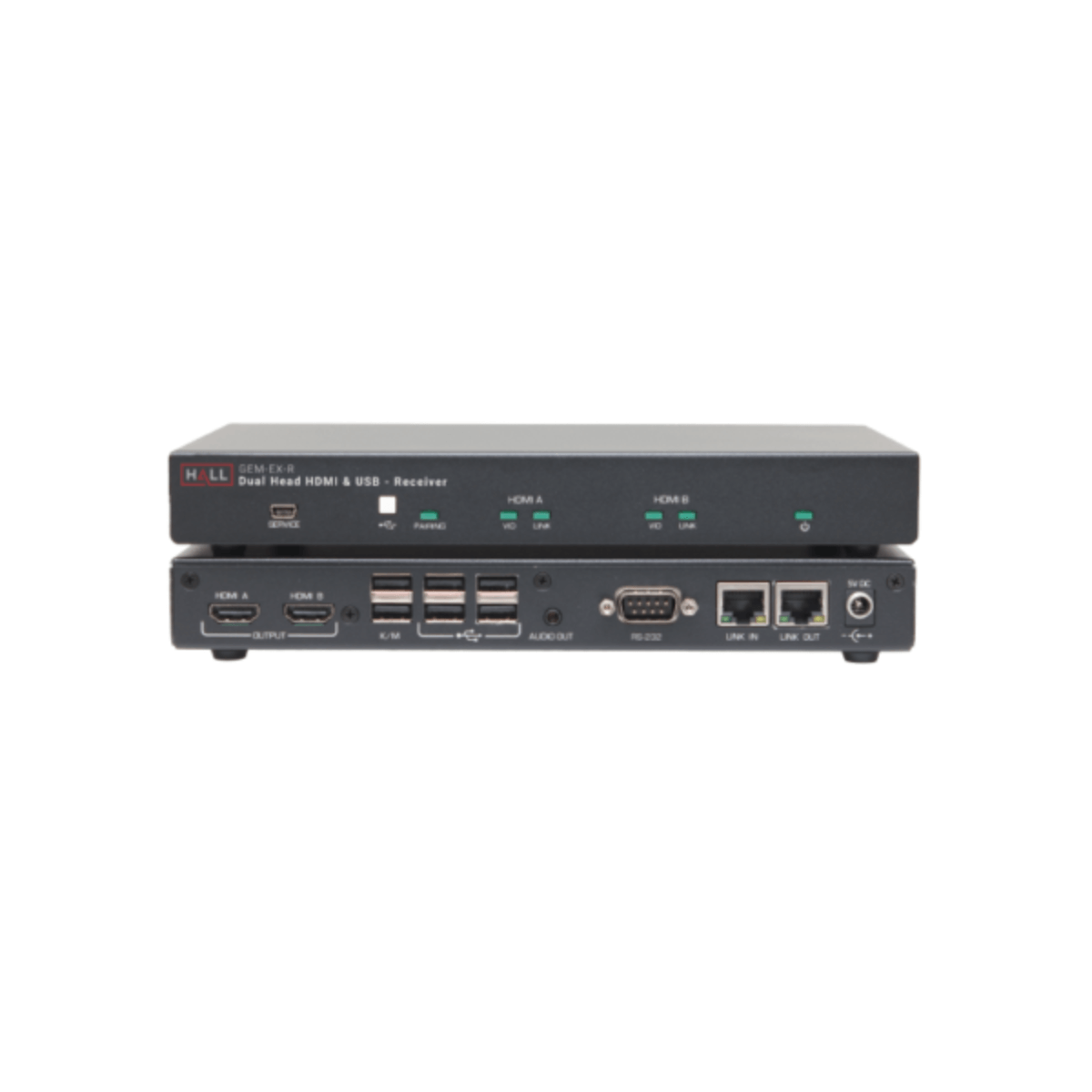 The Sender features two HDMI inputs, one USB input, one analog audio input, and a dual-port capable RS-232 port for connection to a dual-head PC. The audio input is embedded into HDMI A. It provides two local HDMI outputs (corresponding to the two HDMI inputs) and features an internal USB hub with two local USB outputs. Additionally, there are two separate RJ45 output ports to extend these signals to multiple remote locations.