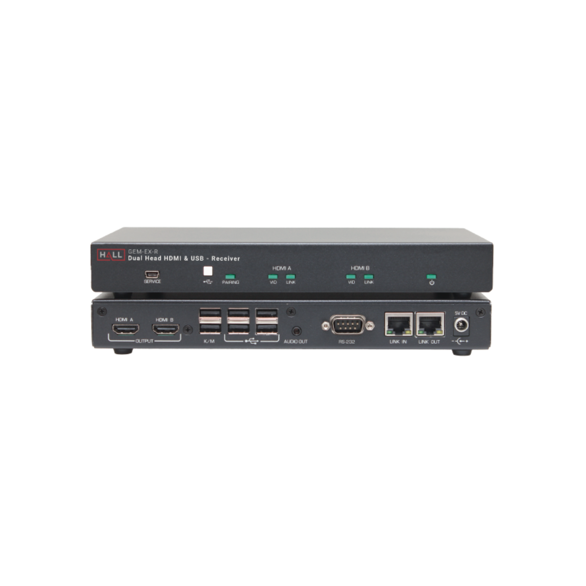 The GEM-EX is comprised of the GEM-EX-S Sender and the GEM-EX-R Receiver. The system is used to extend USB 2.0, Audio, dual RS-232, and dual display HDMI video supporting various resolutions including 1080p @ 60 Hz and 4K UHD @ 30 Hz. These signals are extended to one or more Receivers up to a distance of 100 m (328 ft.) over a single CAT6 cable.