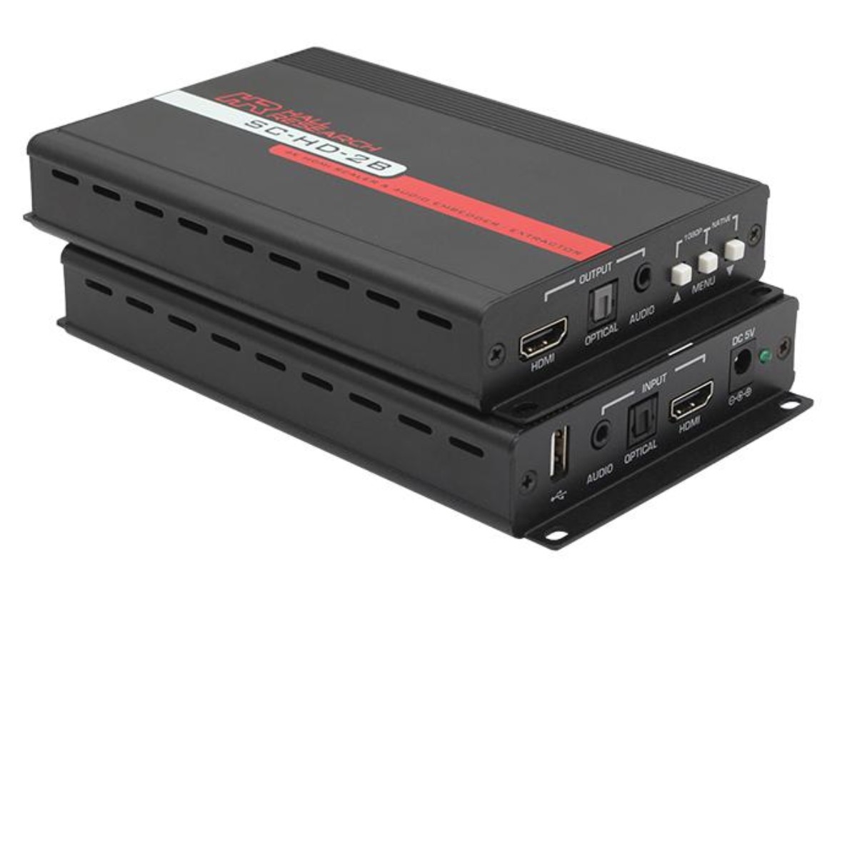 Both stereo analog and optical digital audio inputs and outputs are available. The audio from the HDMI input signal can be extracted (de-embedded) and output on both digital as well as stereo analog signal. The audio embedded into the HDMI output is selectable from one of three sources: HDMI input, analog L/R input, or digital optical input.