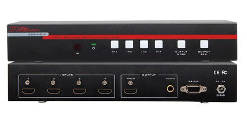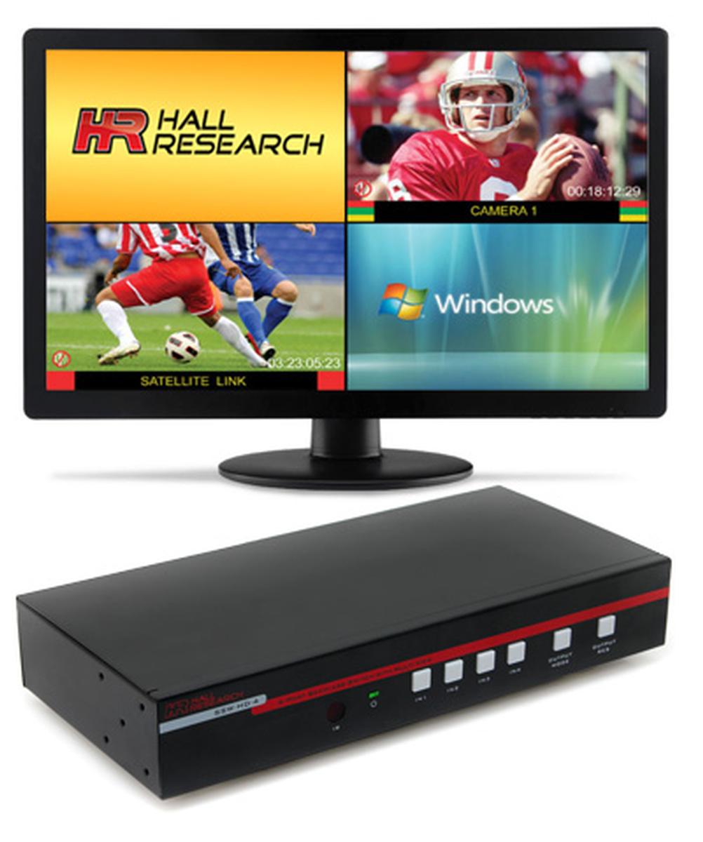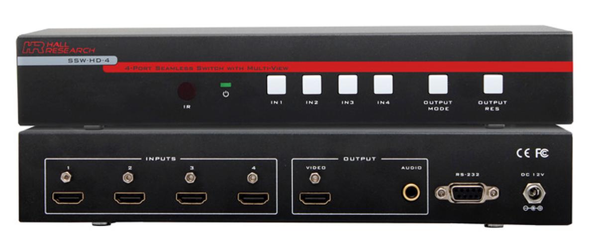 Introducing the SSW-HD-4 4-Input HDMI Seamless Switch from Hall Research, with Real-time Multiview Modes. This device lets the user(s) connect four HDMI inputs and display them on one display with the option to show all four inputs simultaneously in real-time with a variety of layout configurations. Switching between inputs when showing only one input at a time has a zero transition delay and is completely seamless.