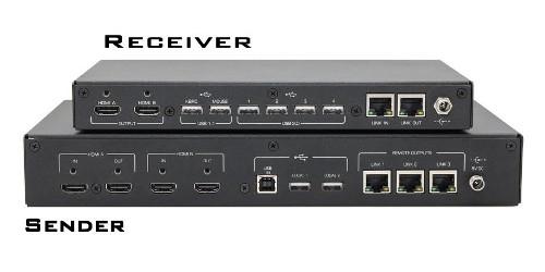 - Three Sender extension outputs and one Receiver daisy-chain output to distribute video to multiple locations