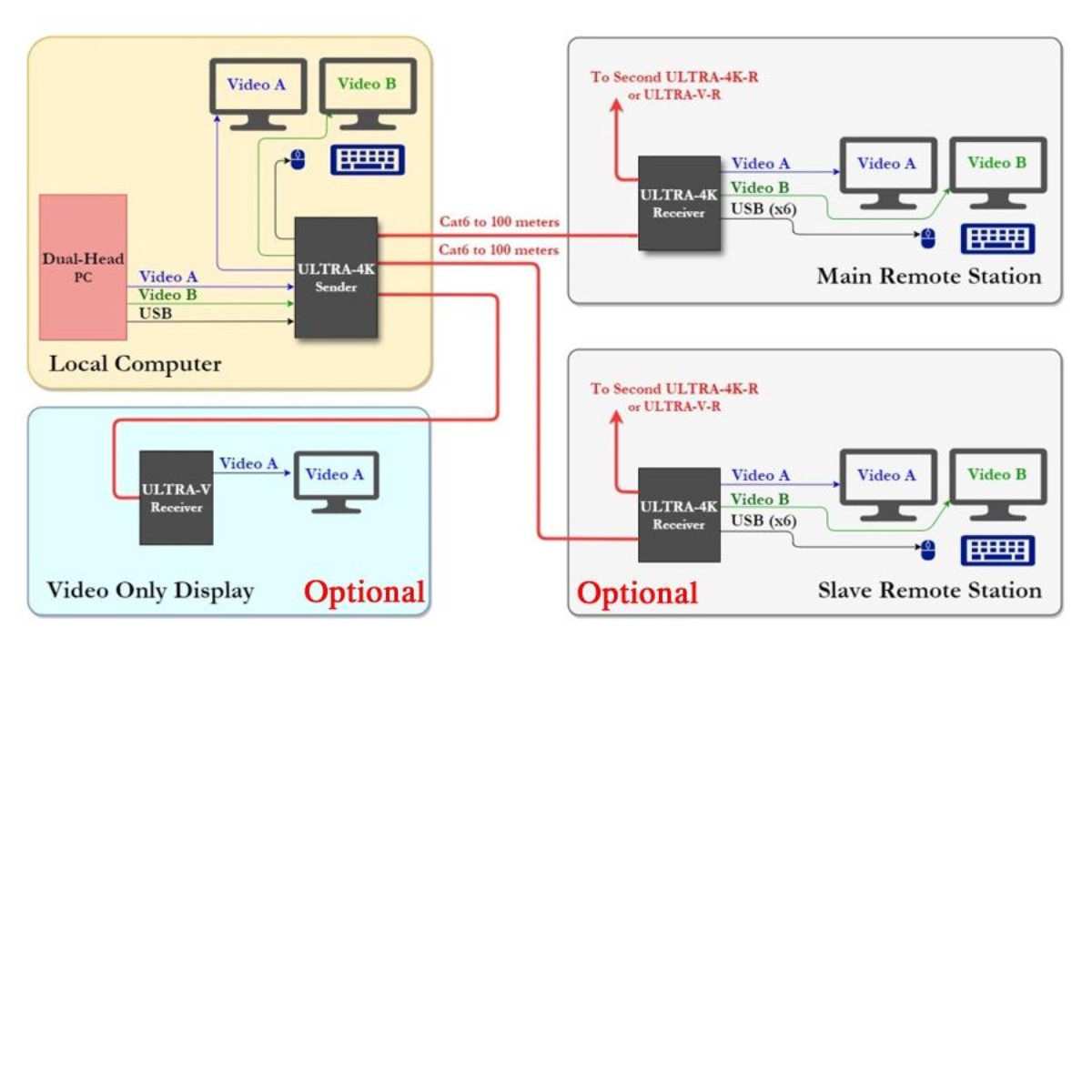 The ULTRA-4K Receiver provides two HDMI video outputs, dedicated keyboard and mouse USB 1.1 ports (with auto switching), and a 4-port USB 2.0 hub for connection of other USB devices such as touch-screens, printers, etc. Plug-and-Play operation requires no setup, just connect the Sender to the Receiver using a Cat6 cable and you are ready to go! The system supports video resolutions to 3840 x 2160 (UHD/4K), but it also supports and is ideal for applications requiring 2560 x 1600, 2560 x 1440, and 1920 x 1080 resolutions. Other standard HDTV and PC resolutions are also supported. The Receivers also feature an RJ45 loop output for connection to other Receivers for expansion. The RJ45 outputs on both the Sender and the Receiver are also compatible with Single-Head video receiver (Model ULTRA-V-R). The ULTRA-V-R by default will display Video A, but it can be user configured to display video B if desired.