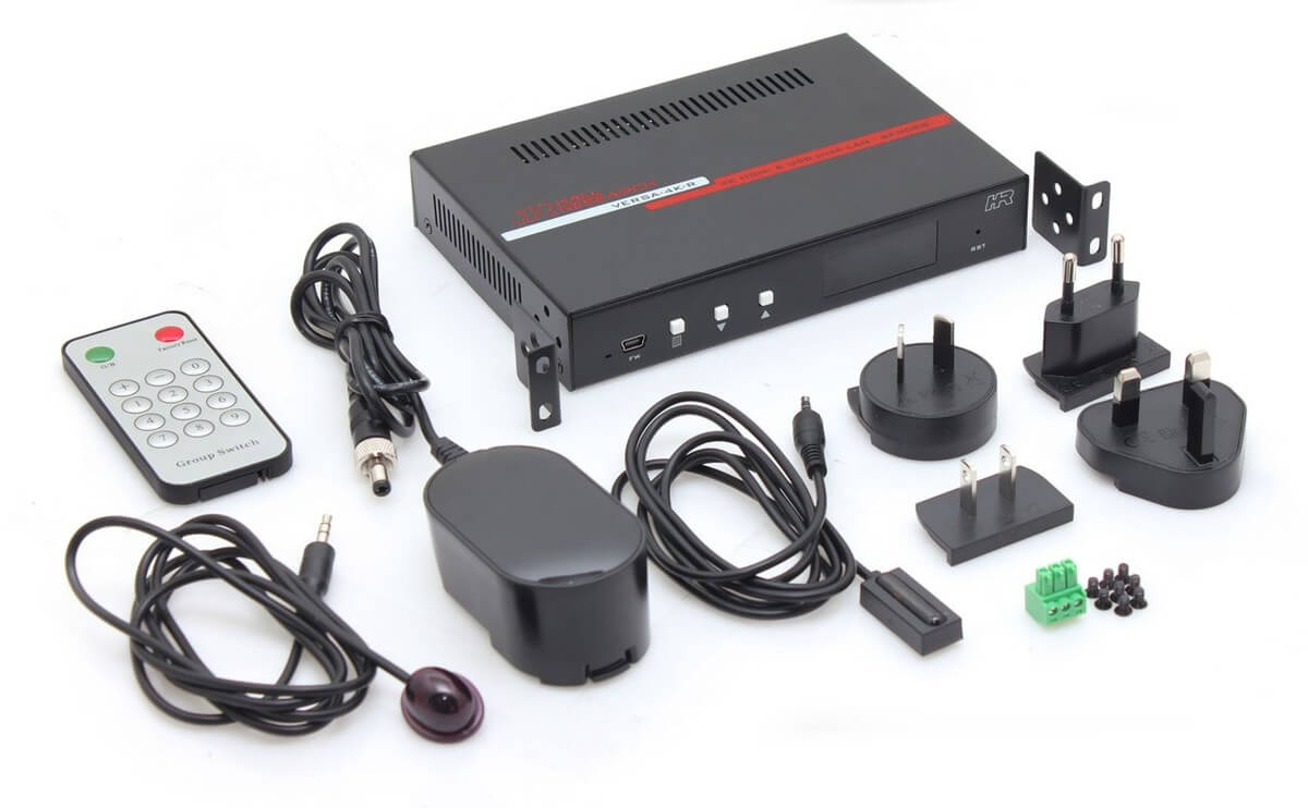 - Package Contents: VERSA-4K-R Main Unit, User Manual Card, Wide Band IR Detector (For extension to sender), IR Detector (For video Chn/Group selection), IR Remote Controller, Universal Power Supply (Used if there is no PoE), Side Brackets (Can rotate 90 for surface mounting)