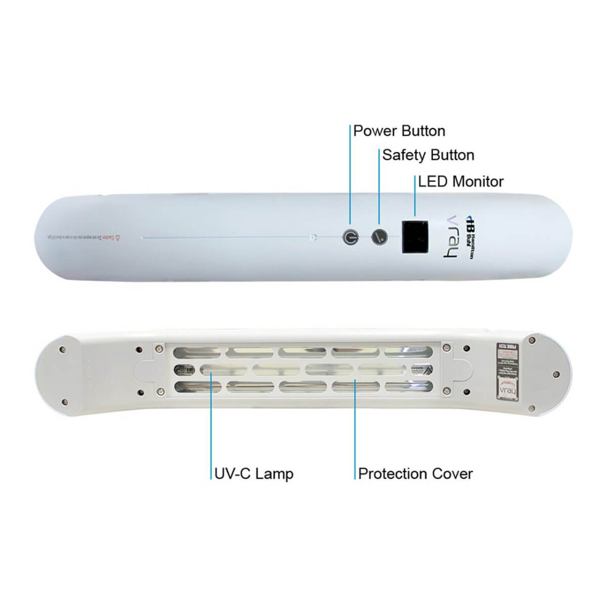A patented safety sensor is activated as the unit is turned on, and Vray turns off automatically when the unit is tilted 30° in either direction, to prevent exposure to skin and eyes, and ensures exposure only to the intended sanitation target. There is also an option to turn off the safe mode to allow sanitization of odd shaped and larger objects.