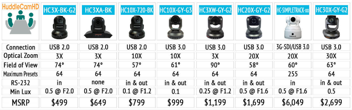 The HuddleCamHD 10X-G3 is easy to install, choose from the included tripod adapter mount, ceiling mount, or optionally purchased wall mount. The 10X-G3 is compatible with 20 different video conferencing software clients so no matter what you use HuddleCamHD has you covered. The 10X-G3 is ideal when you demand the best picture quality and need to be able to significantly zoom.