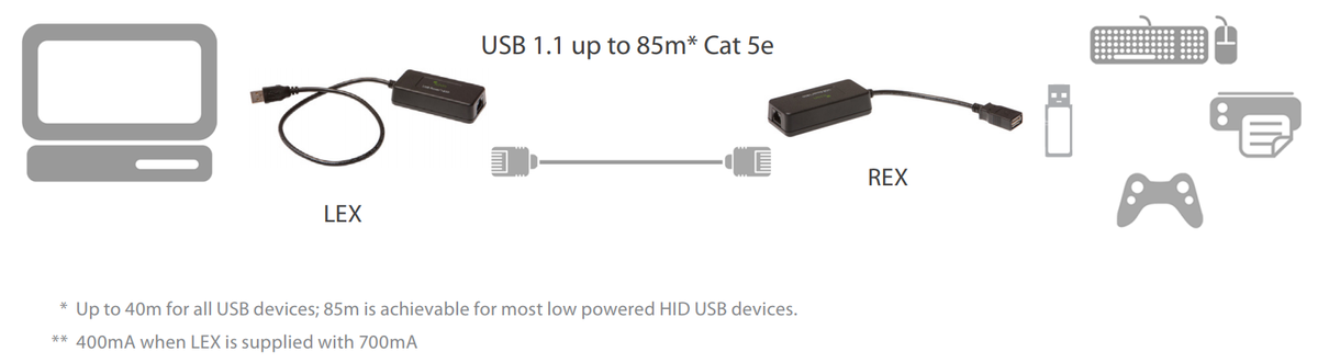 - Low-Speed Range: Up to 279' (device and host dependent) over solid core CAT 5e/6/7 or better