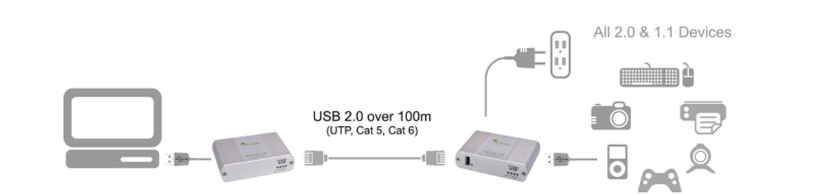 - Direct Connect Range: Up to 330' over Cat 5e (or better) USB 2.0 Speed: Up to 480 Mbps