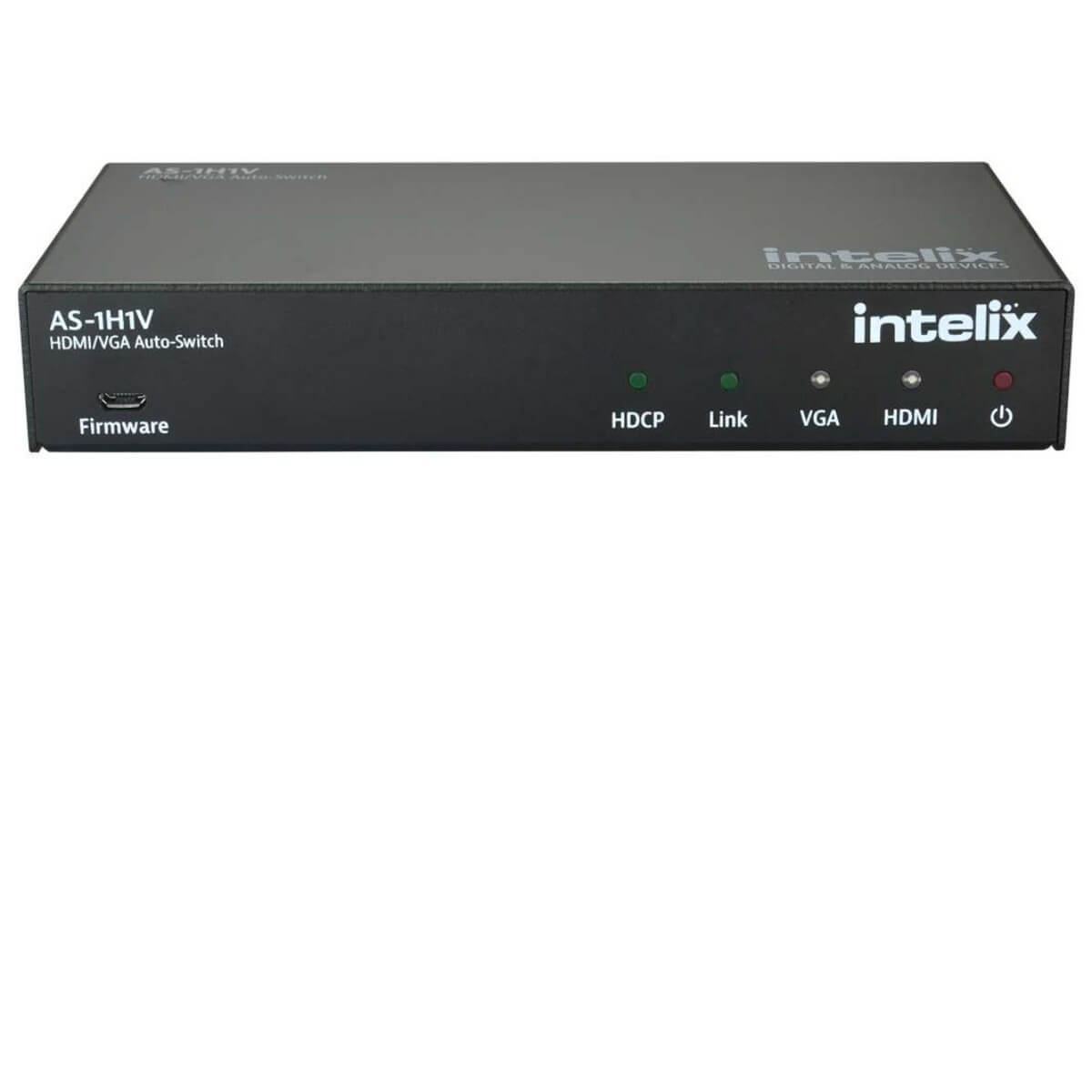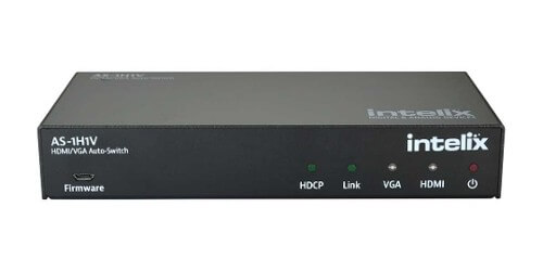 The Intelix AS-1H1V is an under table mounted switcher designed to be the primary PC interface for classrooms, boardrooms, and conference centers. It features VGA + Audio to HDMI conversion with VGA scaling up to 1920x1200 and an HDMI input.