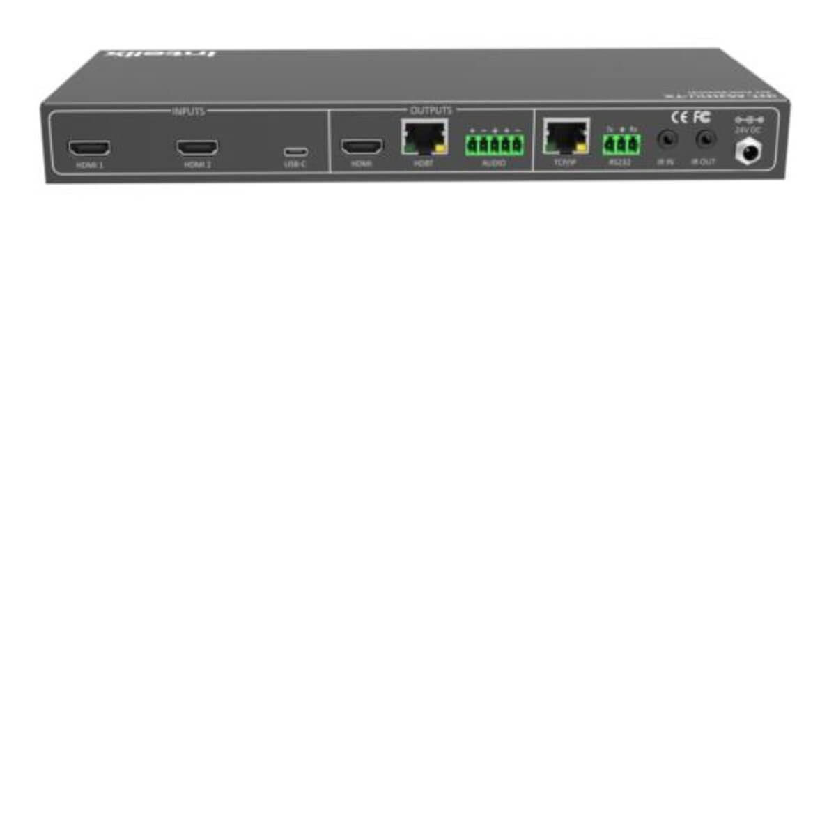 The Intelix INT-AS2H1U-TX is a 3x1 A/V auto switcher that features two HDMI inputs, one USB-C input, one HDMI output, one HDBaseT output and one balanced analog audio output. The USB-C input supports ALT-DP mode and can also charge a connected source device up to 40 watts. The built in HDBaseT transmitter output can transmit HDMI or USB-C audio and video, RS232 and bi-directional IR over a single solid core shielded Category cable to a compatible Intelix HDBaseT receiver up to 70 meters or 230 feet. The INT-AS2H1U-TX supports 1080p video signal up to 70m/230' and 4K signals up to 4K@60Hz / 4:2:0 / 8 bit color up to 40m/130'. The switcher supports CEC pass through (HDBaseT receiver only) and is HDCP 2.2 compliant. A built in web GUI allows easy configuration of A/V routing, EDID, display on/off automation, network and HDCP features. 48V PoH is built in to allow the INT-AS2H1U-TX HDBaseT transmitter output to power a compatible Intelix receiver. The switchers functions can be controlled by built in web GUI, RS232 or by TCP/IP. The INT-AS2H1U-TX can also manually control a connected display to the HDBaseT receiver via CEC or RS232 or can be configured to automate the display ON/OFF whenever a video signal is introduced or absent from the switcher system.