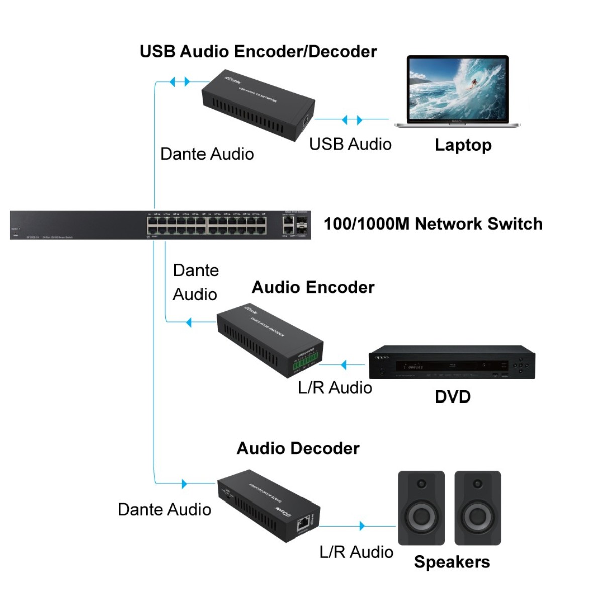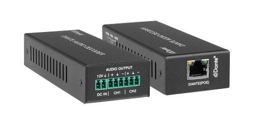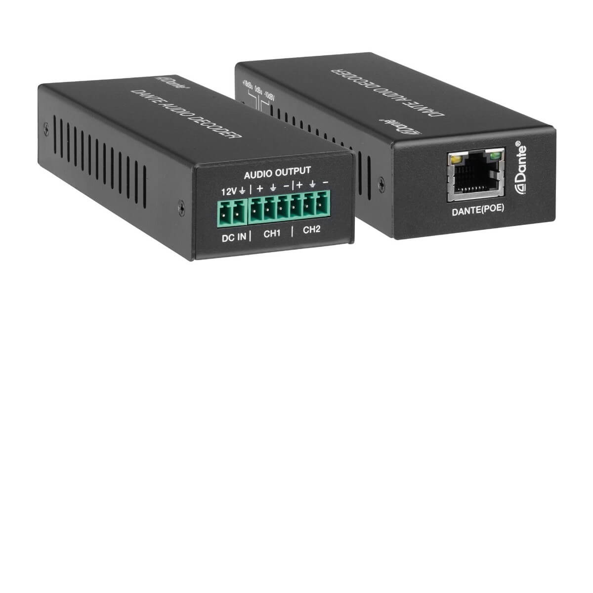 The KanexPro AUD-DTE-DCODE is a professional-grade 2-channel analog audio decoder designed for Dante audio-over-IP environments. Built with the Dante Ultimo chipset, this decoder receives digital audio from a standard LAN network and converts it to high-fidelity analog audio output. Ideal for commercial AV installations, it offers seamless integration, simplified setup through Power over Ethernet (PoE), and superior audio performance for a wide range of applications including conference rooms, media production, and educational facilities.