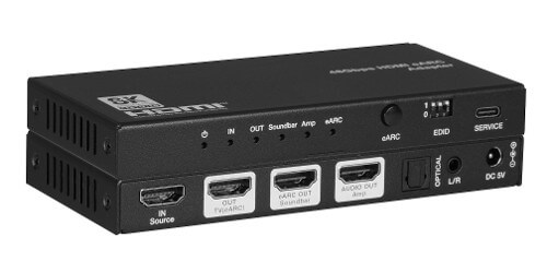 The KanexPro AUD-EARC-8K is designed for de-embedding audio signals from an HDMI source or TV with ARC/eARC, and outputting HDMI audio, digital S/PDIF audio or analog audio to AV Receiver. It supports data rates up to 48Gbps complying with HDMI 2.1 and HDCP 2.3 requirements. It includes several features for ease of integration, such as EDID management and cable equalization. It provides an easy solution for HDMI installations to send audio signals to a soundbar, amplifier or any 5.1/2.0CH sound system. CEC control from TV to the source, amplifier or soundbar is also supported.