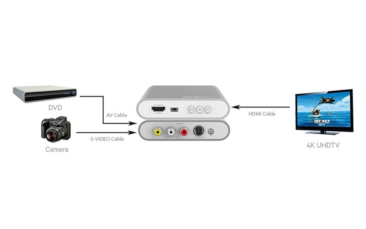 The CON-AV-HD4K by KanexPro is a universal Composite/S-Video to HDMI Converter. This up-scale converter has been designed to upscale one Composite (RCA) or S-Video input to one HDMI 4K60 output. The CON-AV-HD4K is also capable of converting analog to digital formats with multiple adjustments and range to achieve the most optimal video image through use of the front panel buttons for scaling and zoom. It will support PAL, NTSC3.58, NTSC4.43, SECAM, PAL/M, and PAL/N input formats, and uses advanced signal processing technology for fantastic precision, colors, and details. This plug and play device is a an ideal portable solution for scaling analog to 4K digital conversion, and is perfect for use with older AV devices that need to be transformed to 4K UHD display for viewing purposes only.