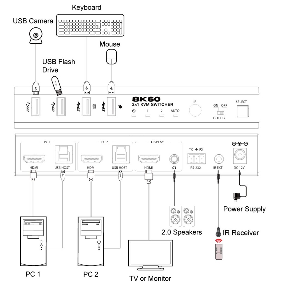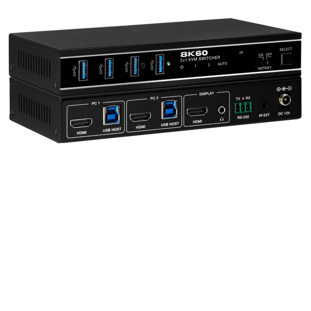 The KVM-2X1HDMI8K is a 2x1 KVM Switcher with hotkey switching.