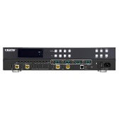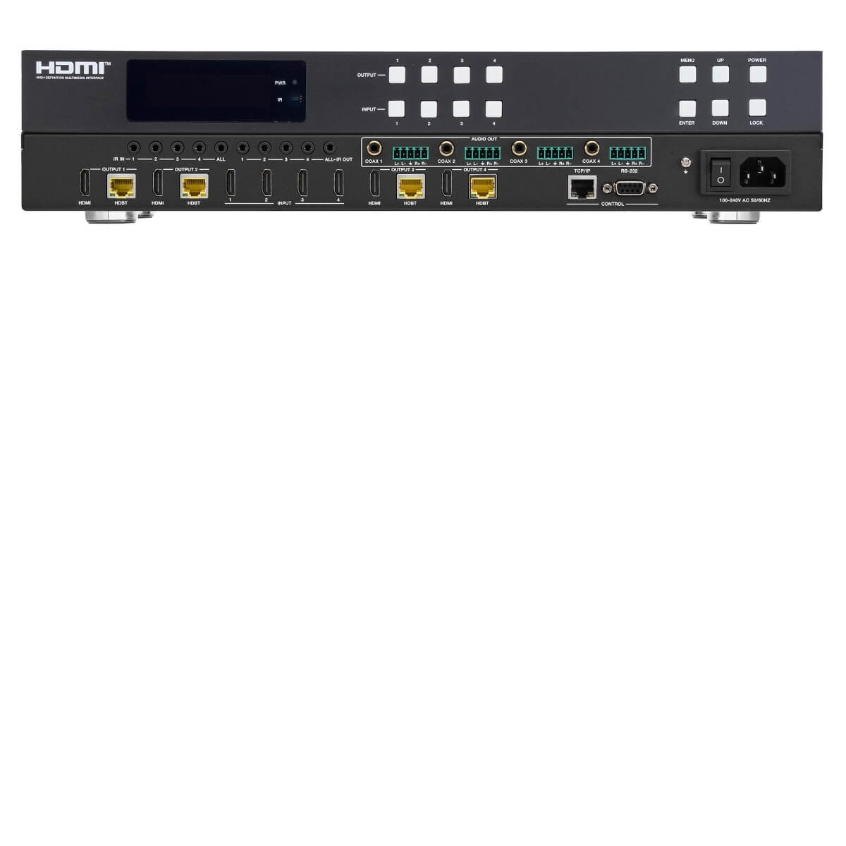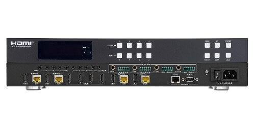 The MMX-4X4CAT-150M is a 4x4 matrix switcher designed by KanexPro, which allows for the routing of HDMI signals over long distances using CAT5e or CAT6 cables. This switcher is ideal for environments that need to distribute HDMI signals over long distances while maintaining high-quality video and audio, all with robust control options.