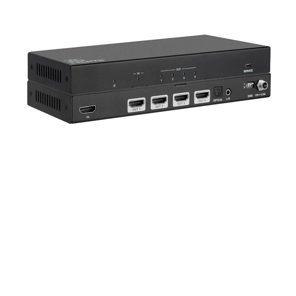 The KanexPro SP-1X4A8K 8K HDMI 1x4 Splitter has the ability to distribute a single HDMI source signal to two display devices. This product supports video resolution of up to 8K at 60Hz and 4:2:0, and also features advanced EDID management and audio de-embedding functionality, with audio output available through both optical and analog ports. This versatile product has numerous applications, including demonstration, video conferencing, multimedia teaching, and any other occasions that require large-screen display.