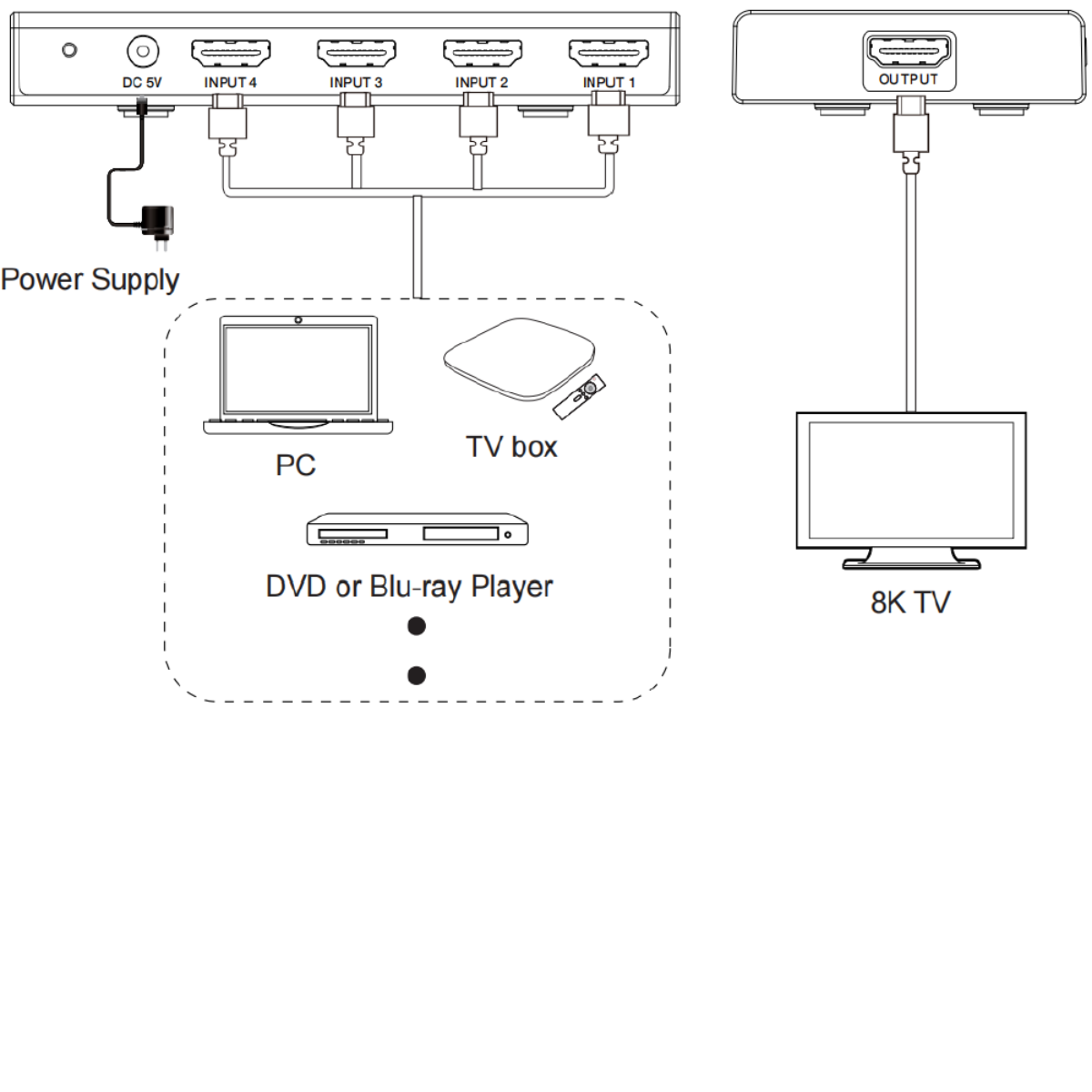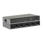 The KanexPro SW-4X18K 8K HDMI 4x1 Switcher allows switching between four HDMI sources to display them on a single HDMI display with 8K at 60Hz and 4:4:4 with 48Gbps video bandwidth. Suitable for various applications, four HDMI sources can be connected to the input ports via individual cables, and the front panel switch button can be used to toggle between them. Please note that it's not bidirectional and only supports 4 in 1 out, and is compatible with Xbox and PS5 for 4K at 120Hz resolution on TVs or monitors.