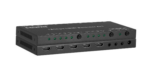 The KanexPro SW-4X1HDAUD is a high performance HDMI 4x1 switcher that supports HDTV formats up to 4Kx2K@60Hz and all HDMI 3D TV formats. It can extract HDMI stream audio to separate digital and analog audio output. This product supports HDCP repeater/ CEC/ARC functions. Select any of the inputs by front panel button or IR Remote, the corresponding indicator LED on the front panel will be illuminated.