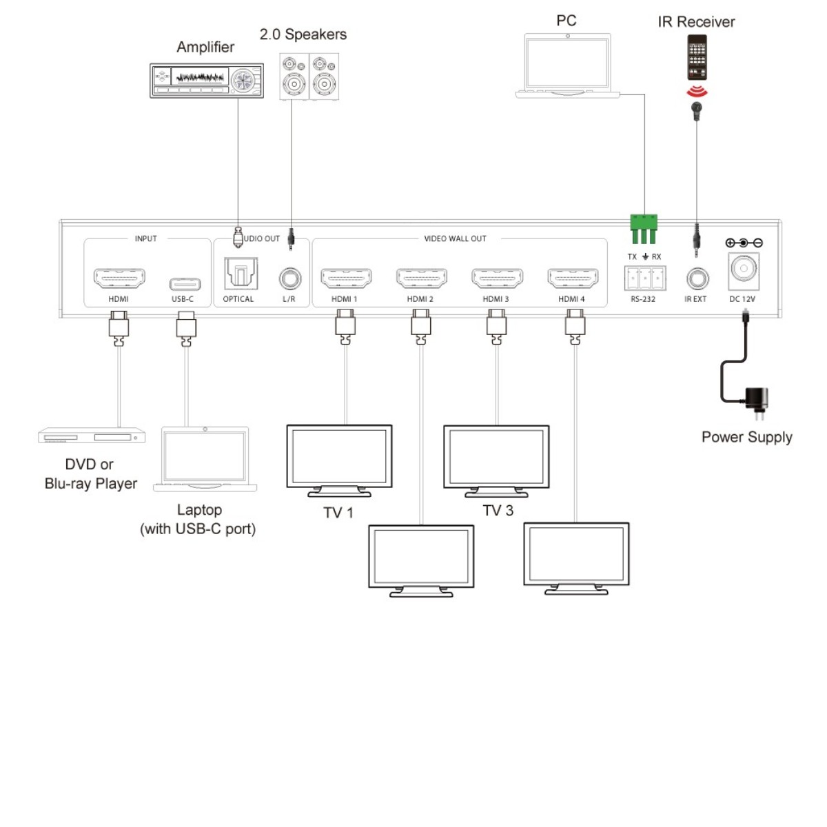 HDMI USBC 1x4 Video Wall Splitter 4K
