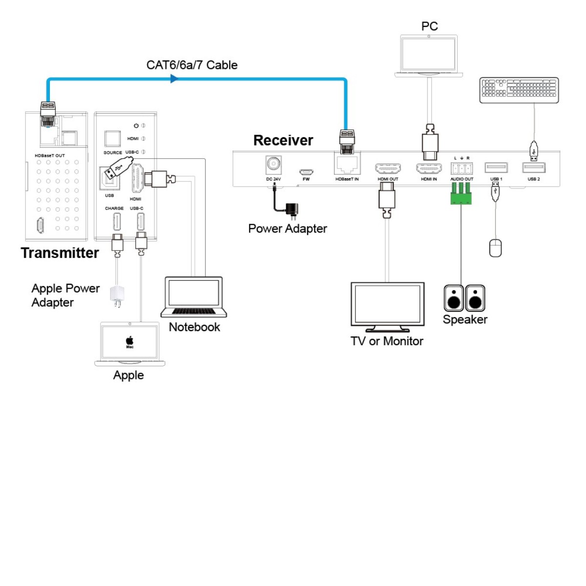 2x1 HDMI USB C Wall Plate Kit KVM USB POE 40M 4K60 70M 1080P