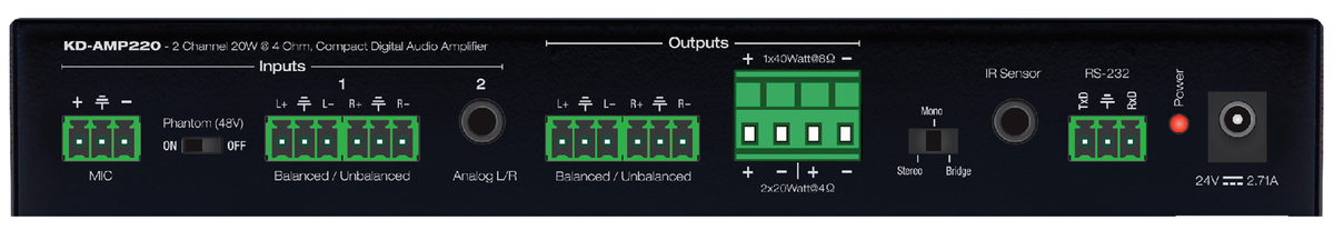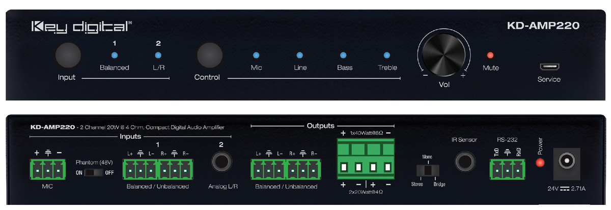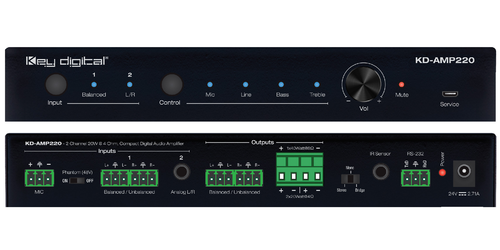 Key Digital introduces the KD-AMP220: a class-D amplifier featuring 8 Ohm speaker output. This digital audio amplifier's inputs enable microphone, line level balanced/unbalanced, and 3.5mm stereo analog audio inputs. Its outputs include a mixture of audio from the input microphone and the selected audio input. The KD-AMP220's volume is simple to control, featuring IR, RS-232, and a front panel.