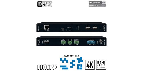 Key Digitals 4K AV over IP system may be scaled to fit any installation need. Add an Encoder per video source or Decoder per video display and use a verified network switch as the central point of this HDMI AV routing and distribution system. The Key Digital 4K AV over IP system is completely integrated, with Encoder and Decoder product options including video wall, mosaic video wall, independent audio and video routing, control, audio pre-amp, app-ready user interface capabilities, and more.
