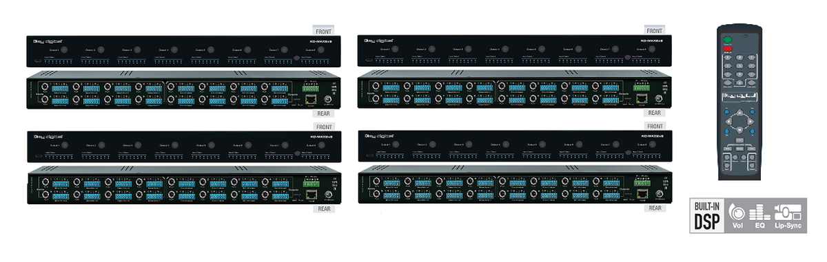 Key Digital created a high-performance 32x8 audio matrix switcher featuring built-in audio DSP. Built-in audio DSP provides variable sound level settings for volume, muting, 3-band EQ, balance, and lip-sync delay per balanced output. The KD-MAX8x8 specializes in multi-format multiplexing, enabling the following conversions: