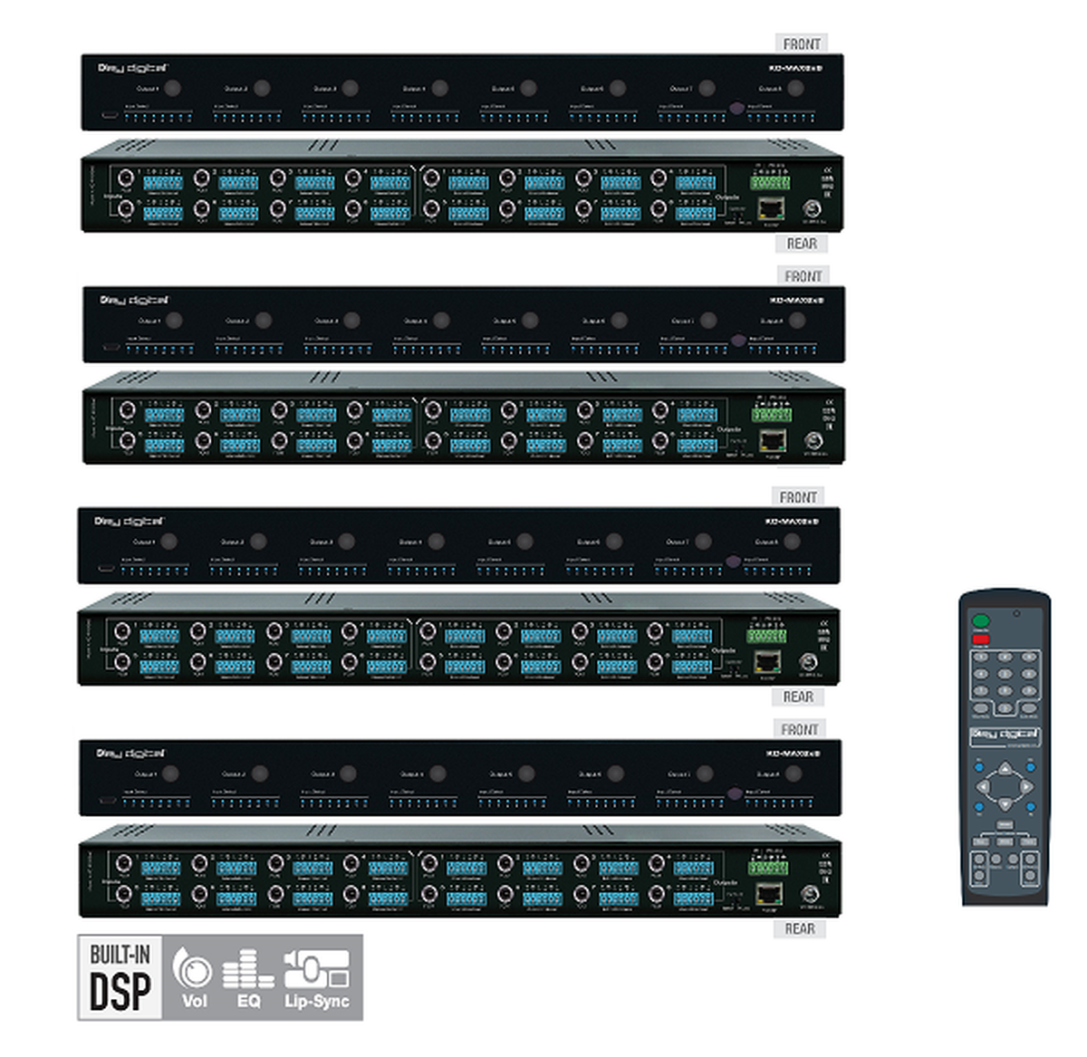 Key Digital created a high-performance 8x32 audio matrix switcher featuring built-in audio DSP. Built-in audio DSP provides variable sound level settings for volume, muting, 3-band EQ, balance, and lip-sync delay per balanced output. The KD-MAX8x8 specializes in multi-format multiplexing, enabling the following conversions: