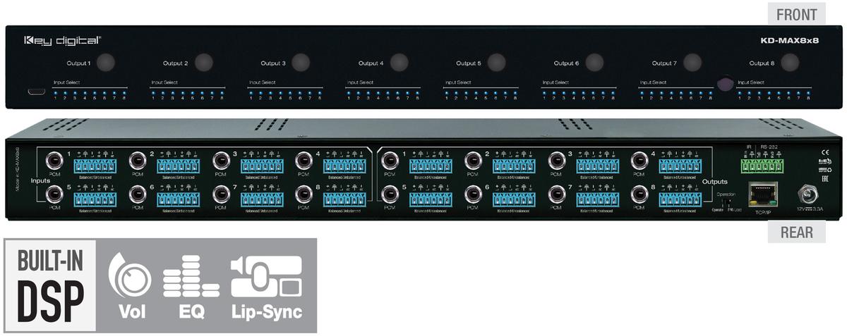 Key Digital created a high-performance 8x8 audio matrix switcher featuring built-in audio DSP. Built-in audio DSP provides variable sound level settings for volume, muting, 3-band EQ, balance, and lip-sync delay per balanced output. Thanks to Dolby and DTS surround, you get a fully lossless compressed digital audio experience. Balanced audio connection enables longer cable runs, so you can send signals as far as 1,000 feet.