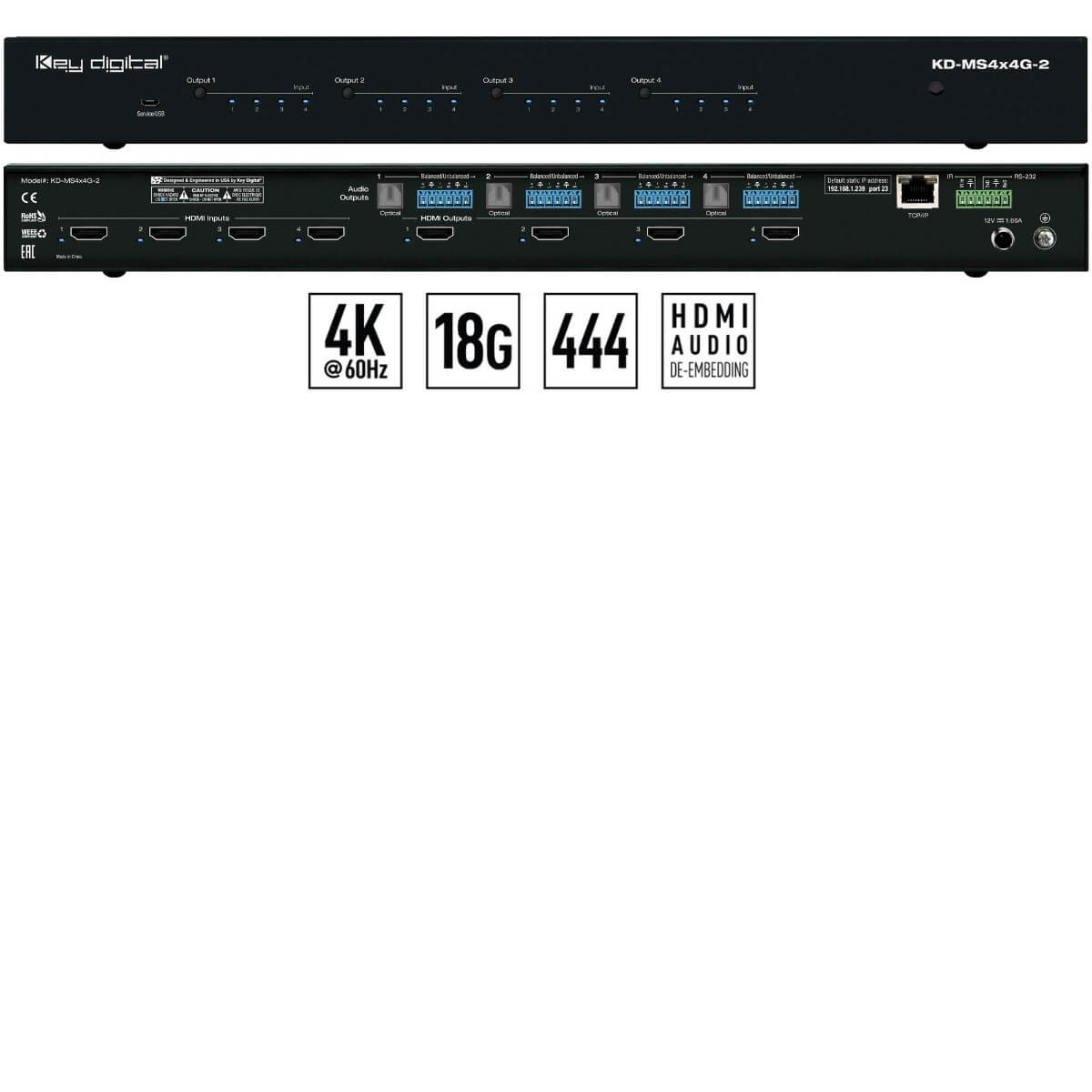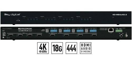 Key Digital’s KD-MS4x4G-2 is a 4K matrix switcher with support of 18Gbps signal bandwidth and HDCP 2.2 for routing and distributing 4 HDMI source signals to 4 displays. KD-MS4x4G-2 features 4 analog balanced/unbalanced and optical digital audio outputs which may be independently controlled to follow the HDMI output selection or separately switched to accommodate a wide variety of usage applications in professional AV systems integration. KD-MS4x4G-2 supports all SD, HD, VESA and Ultra HD/4K video standards up to and including UHD/4K 18G and 1080p. All UHD/4K EDID handshake files include HDR header information.