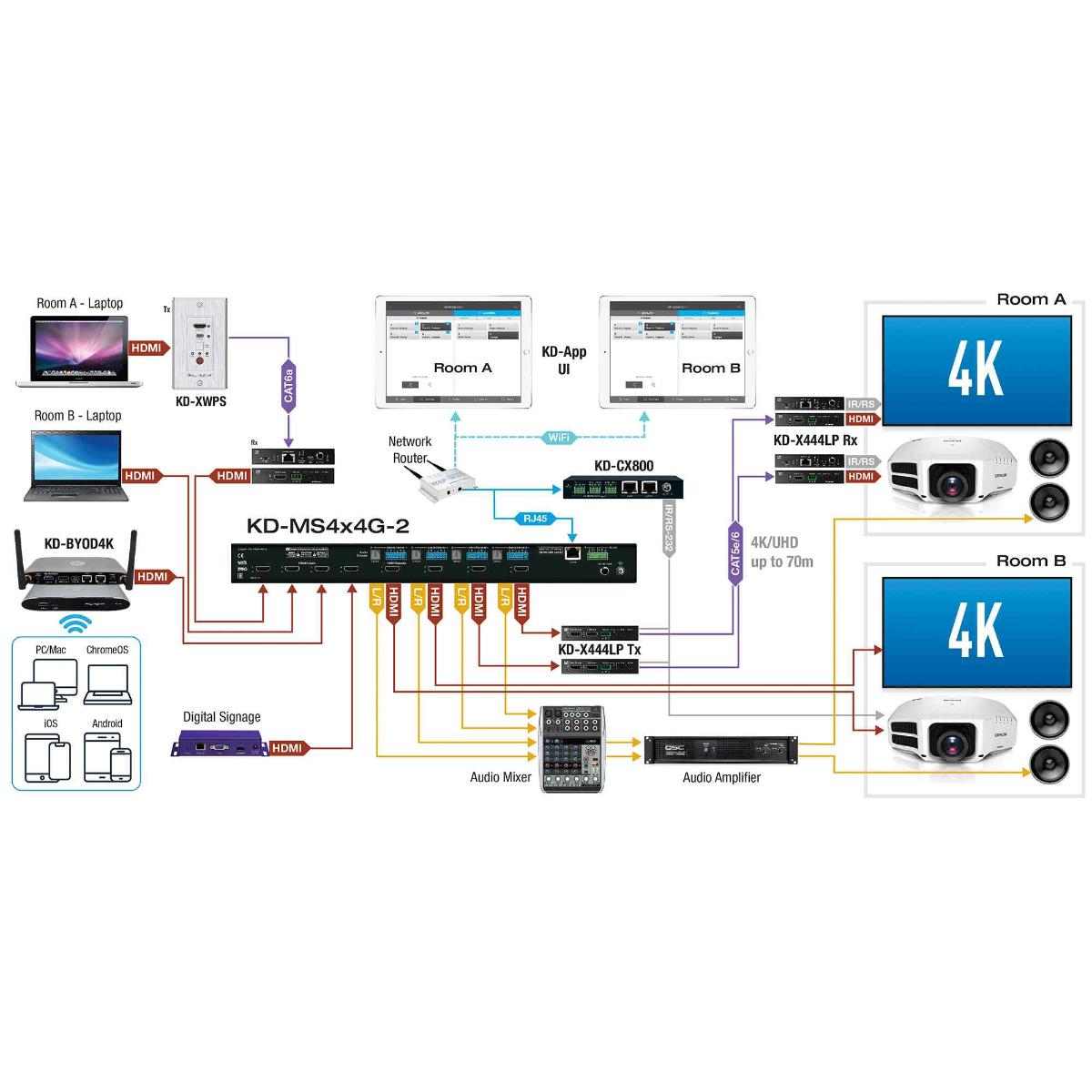 - HDMI Matrix Switching: 4 HDMI sources to 4 HDMI outputs