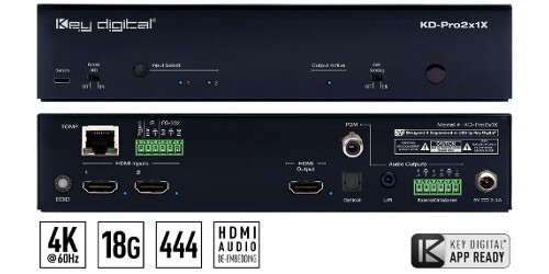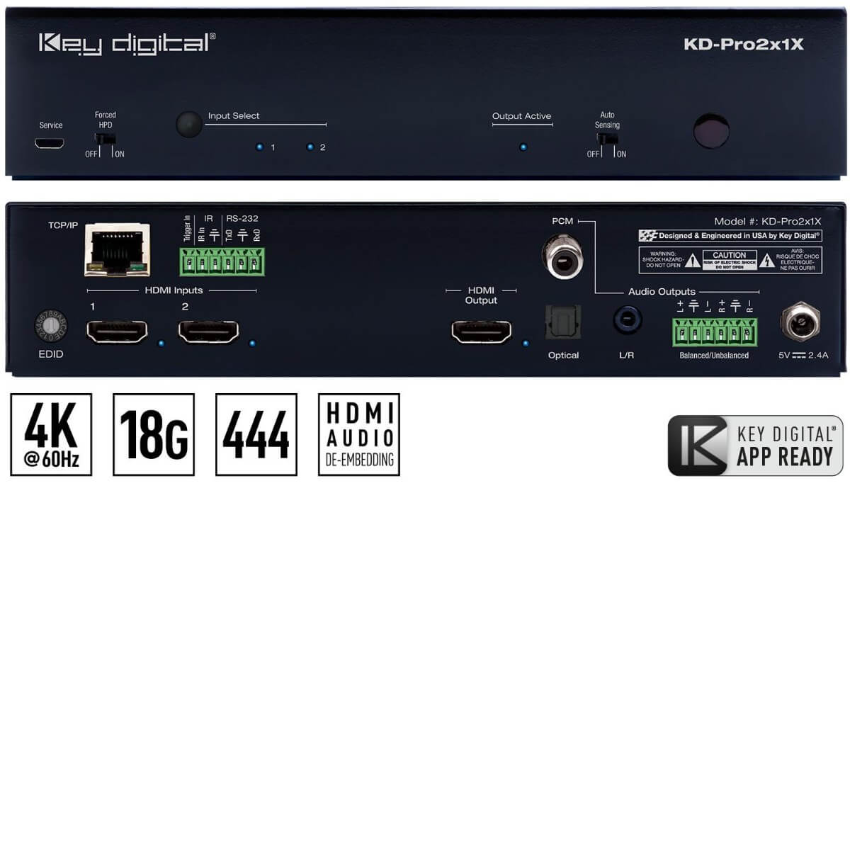 2x1 4K/18G HDMI Switcher with De-Embedded Audio Output (Optical/Balanced Audio) and IP Control