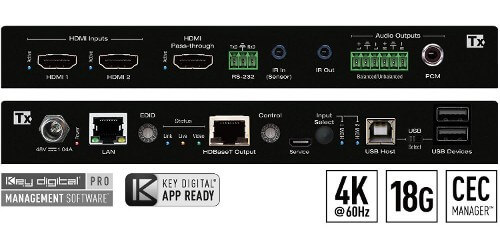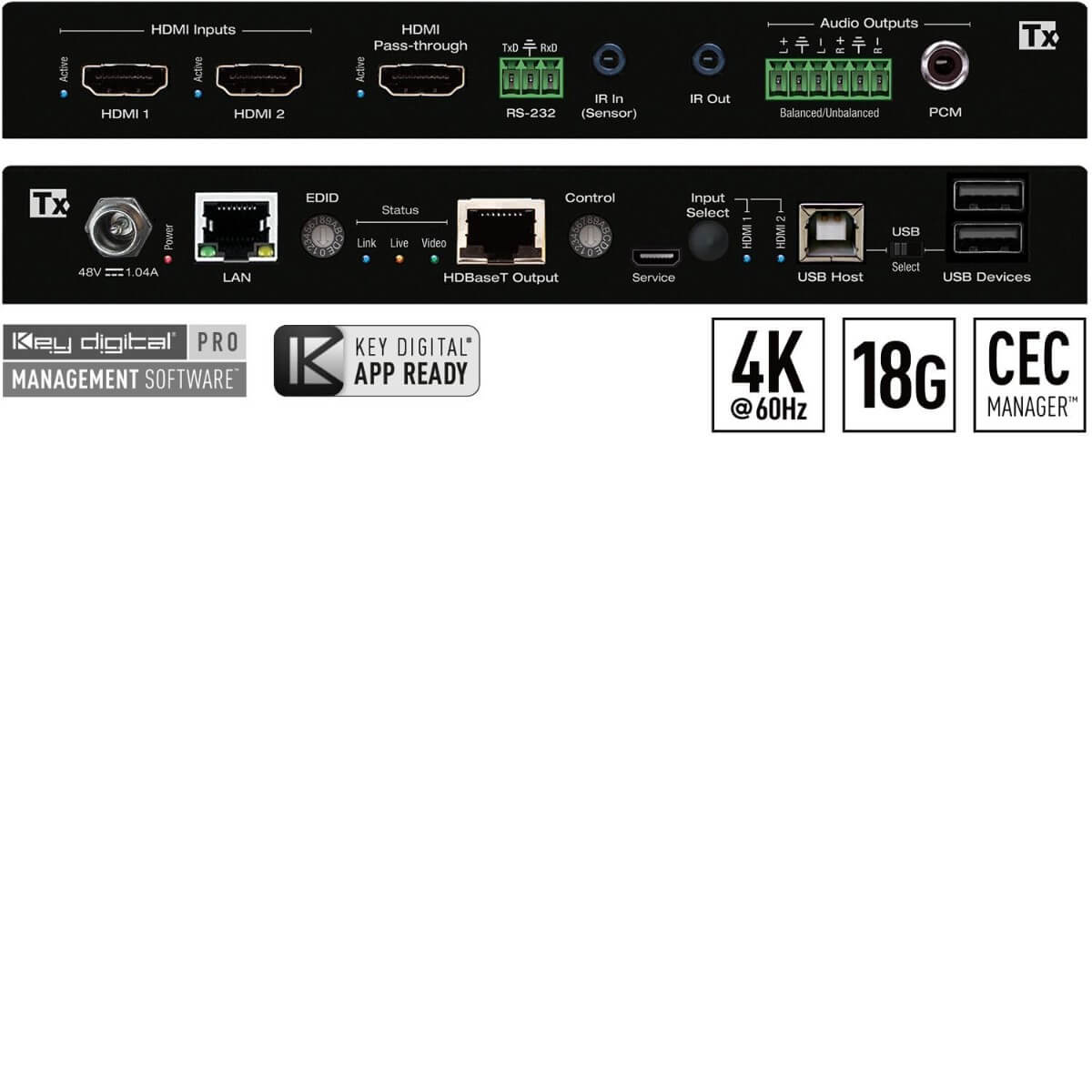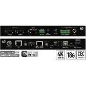 4K/18G 328ft (100m) HDMI over HDBaseT Extender, 2x1 Switcher with 2 HDMI Inputs, 2 Mirrored Outputs (HDBaseT, HDMI), USB 2.0 KVM, LAN, Audio De-Embed, IR, RS-232, IP Control, PoH, CEC Manager™. Tx Only.
