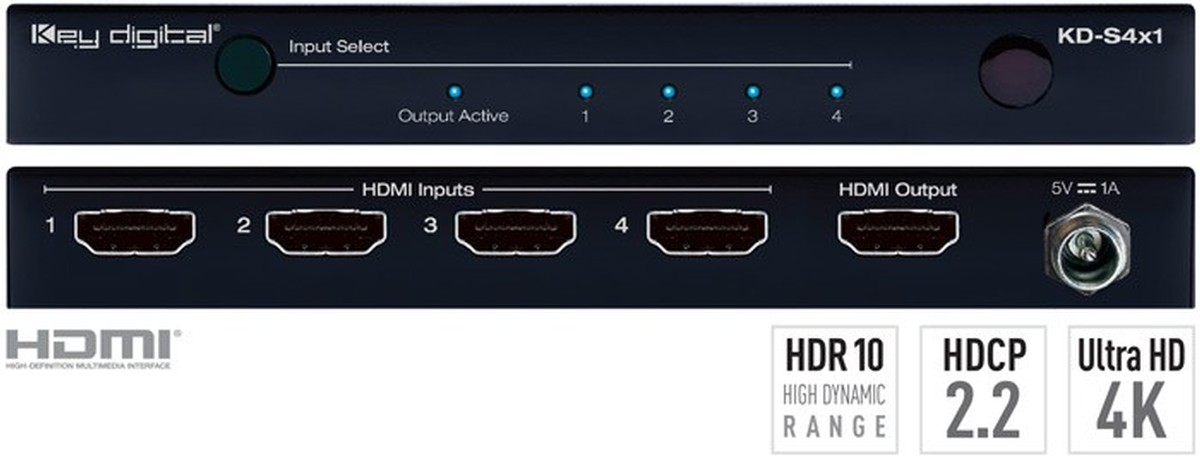 The KD-S4x1 4-port HDMI Switcher from Key Digital supports High Dynamic Range (HDR10), is compatible with HDCP 2.2, and Ultra HD 4K60 (4:4:4). This device allows the user to connect up to four HDMI sources to a single HDMI display. It is capable of passing 3D formats and has EDID control with an included library of 16 different EDID configurations for each individual input. This is a Full Buffer System that manages TMDS re-clocking and signal re-generation, authentication for HDCP source & display, hot-plugging management, as well as EDID Control handshake.