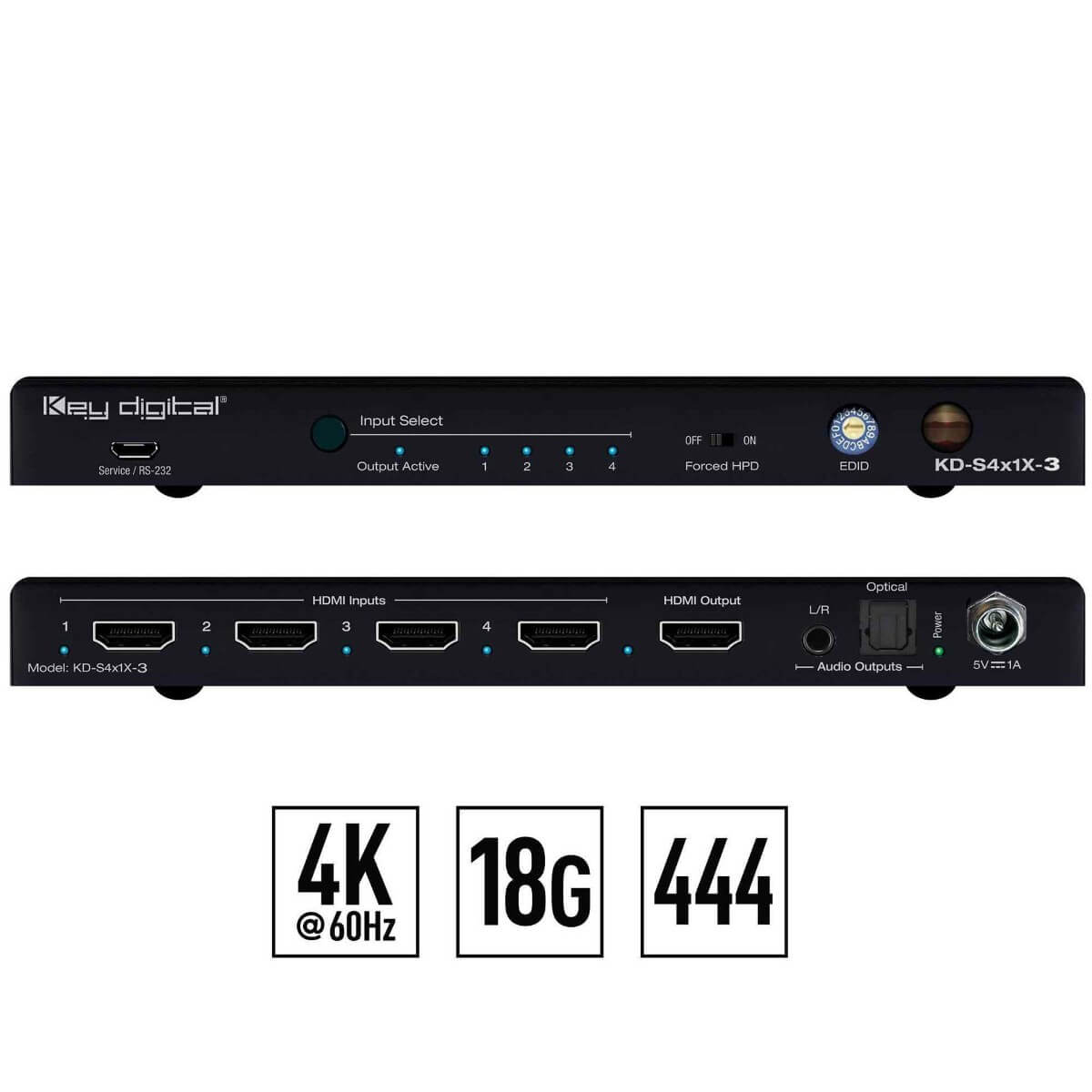 The Key Digital KD-S4x1X-2 is a slim-series HDMI switcher offering professional-level quality, performance, and reliability at a cost-effective price point.