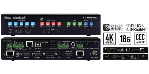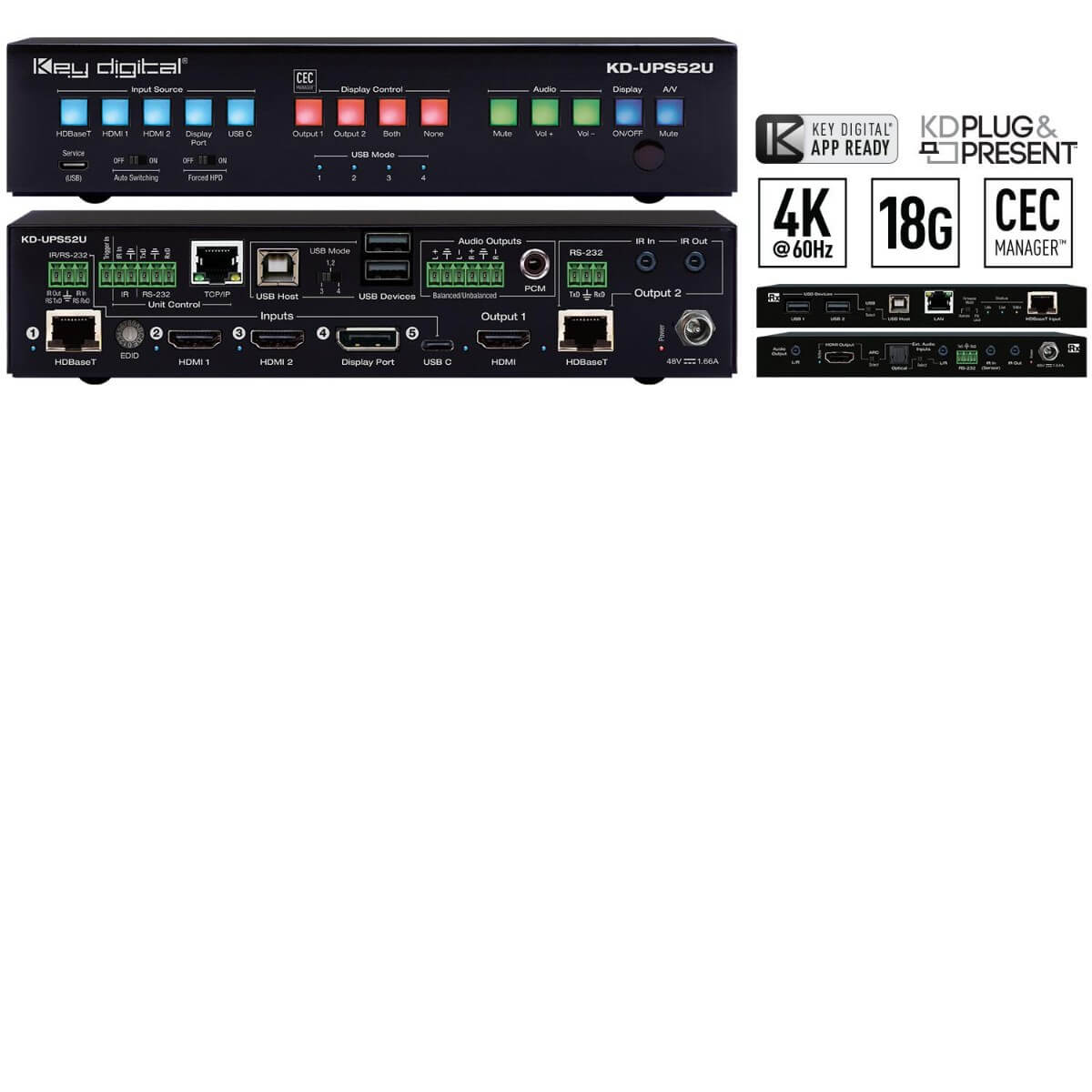 4K/18G USB/Universal Presentation Switcher with 5 Inputs (HDBaseT, 2x HDMI, DP, USB-C), 2 Mirrored Outputs (HDBaseT, HDMI), LAN, ARC, Audio De-Embed, IR, RS-232, IP Control, USB 2.0 KVM, CEC Manager™. Includes Rx.