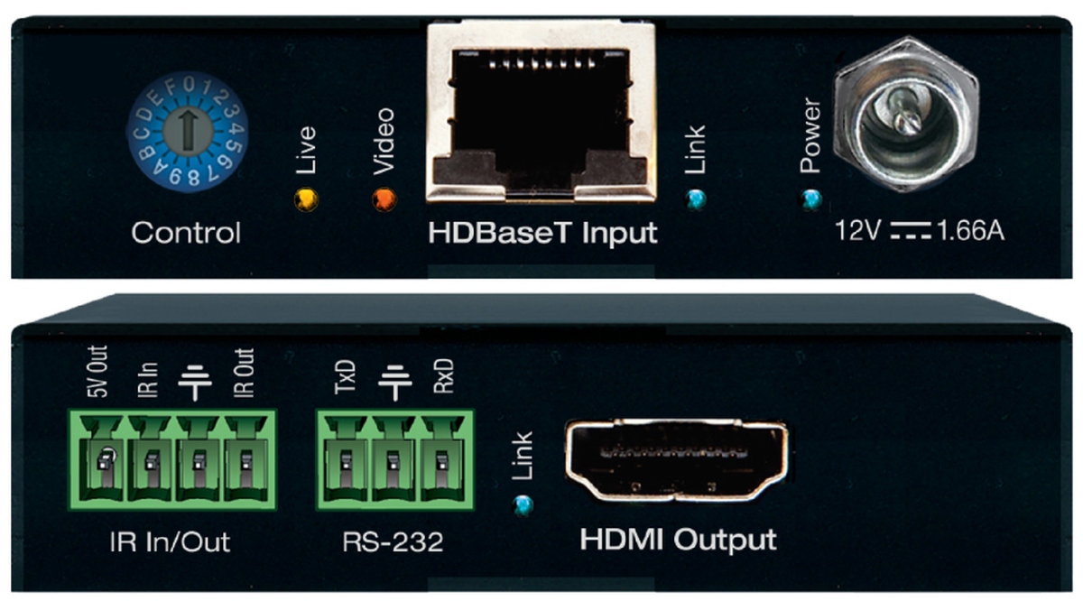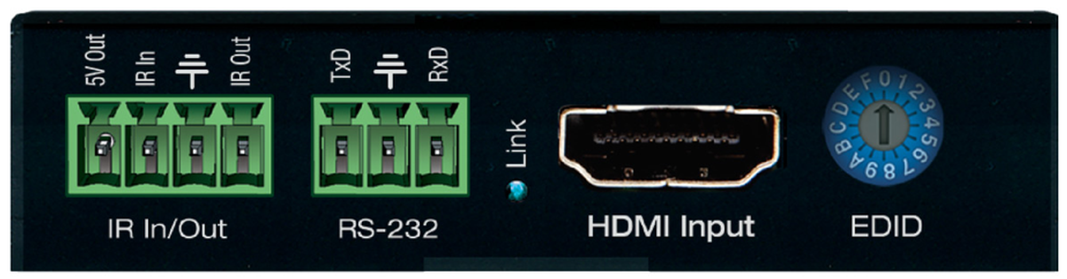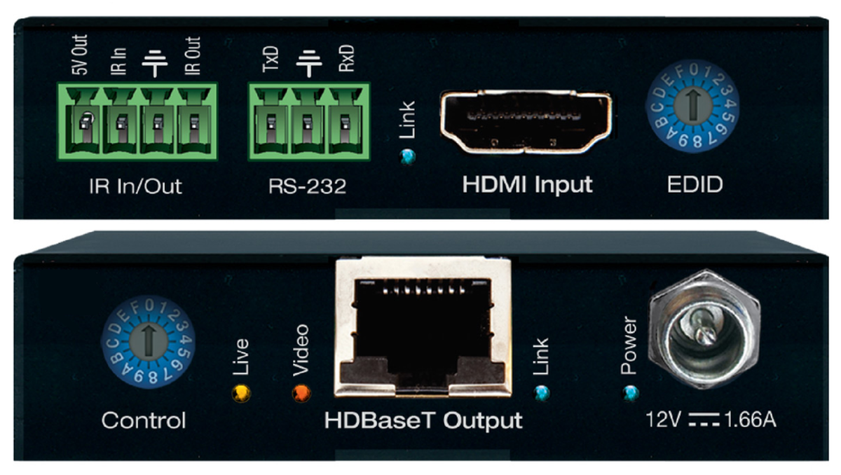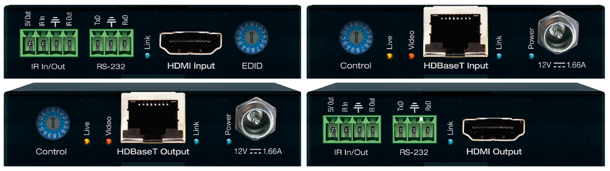 - Transmitter Outputs: 1 HDBaseT, 1 IR, 1 RS-232