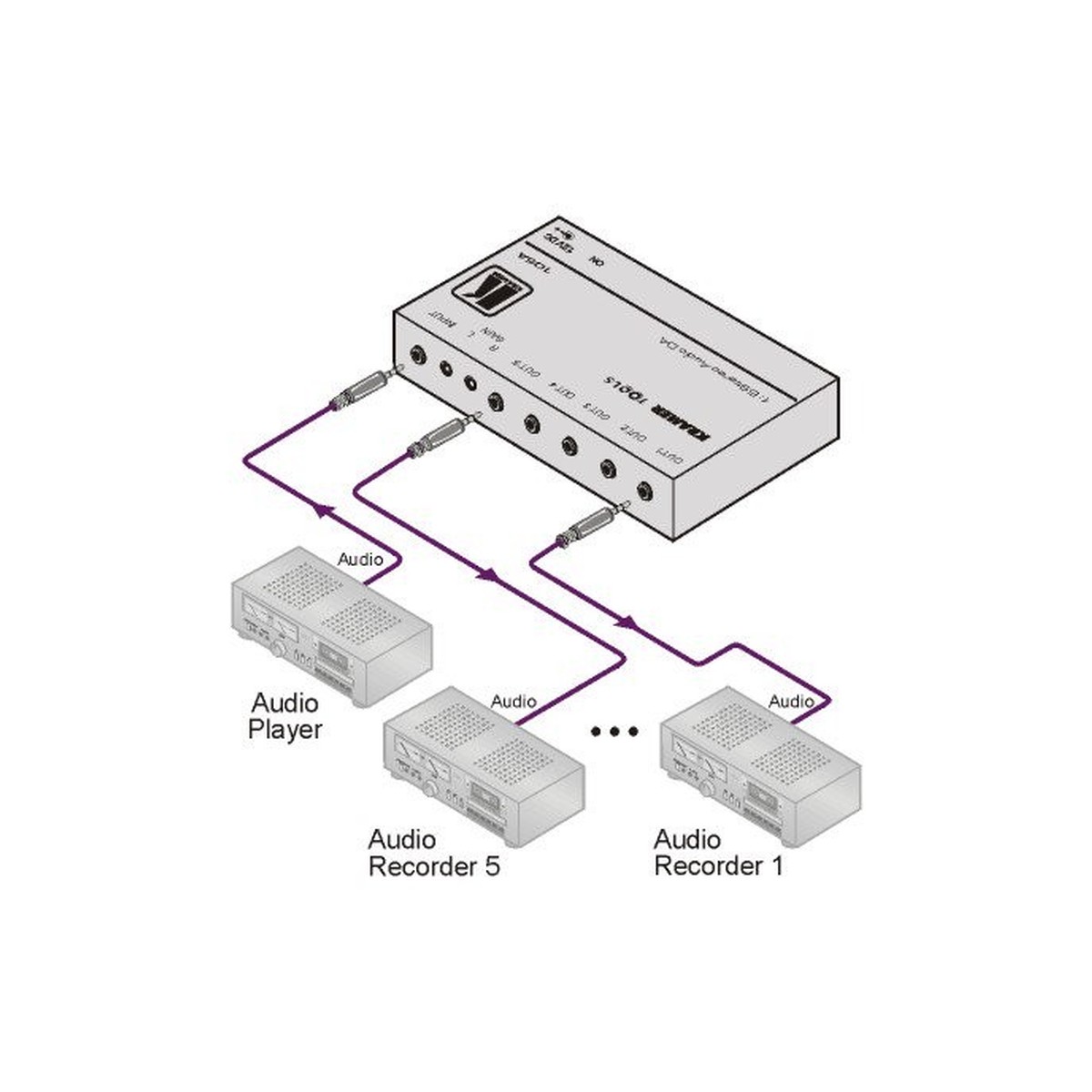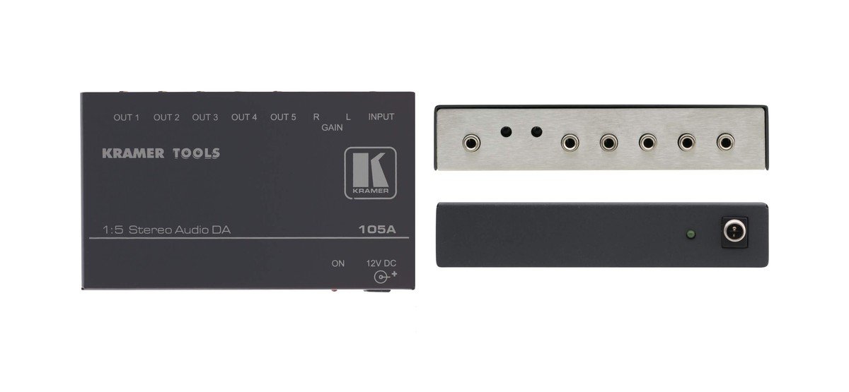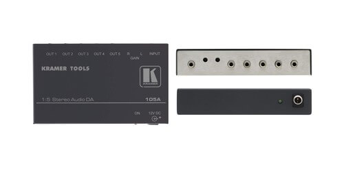 The Kramer 105A 1x5 is a high-performance distribution amplifier for unbalanced stereo audio signals. It takes one stereo input and distributes the signal to five identical stereo outputs. Using compact Kramer TOOLS, you can rack-mount 3 units side-by-side in a 1U rack space with the RK-3T rack adapter. This distribution amplifier is ideal for audio/video duplication studios, retail showrooms, home theater systems, and any other audio system requiring multiple outputs from a single source.