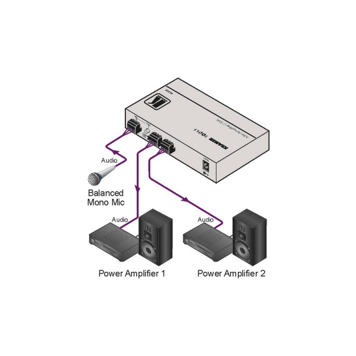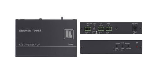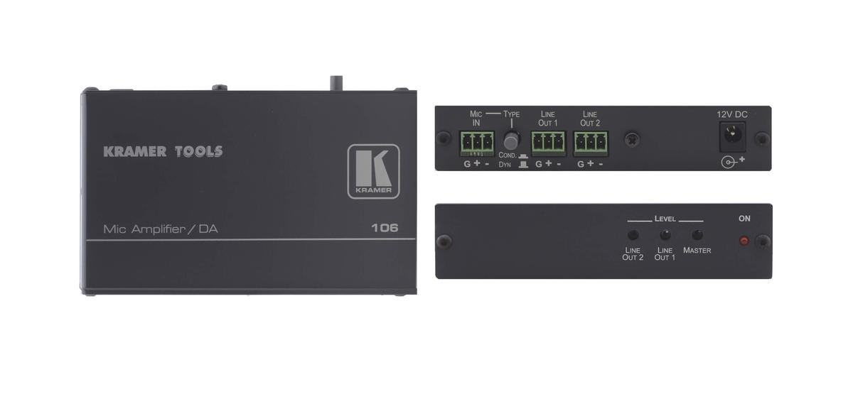 The Kramer 106 is a high-end distribution amplifier for balanced mono microphone signals. The amplifier works by taking one dynamic or condenser microphone input and then distributes the signal to two line-level outputs. Individual and master output adjustments are achieved through Level (Gain) Controls. The 106 features three trimmers to adjust the LINE OUT audio level, a switch for selecting the type of microphone (condenser or dynamic) and two balanced mono line outputs for power amplifiers, and uses 48V DC phantom power.