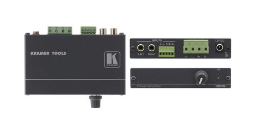 Kramer's 900N is a high-performance stereo audio power amplifier for balanced or unbalanced stereo audio signals. This device features 2 inputs and either one can deliver a speaker output of 8.4 watts RMS power per channel into a 4Ω load. This device is primarily used in presentation rooms and multimedia applications for quick, local audio amplification, or for personal audio listening (for example a PC and portable CD player). The 900N features an audio level knob to adjust the audio level output, an "On" LED indicating the unit is powered on, a 12V power source which makes it ideal even for field operations, and an easy to connect detachable terminal block connector. The compact size of this device allows for 3 units to be rack mounted side-by-side in a 1U rack space.