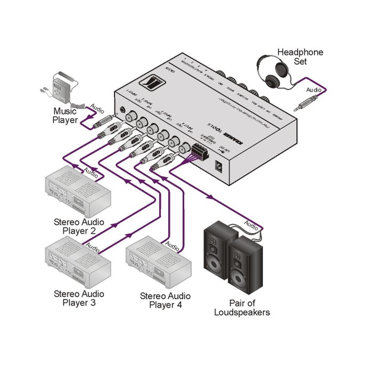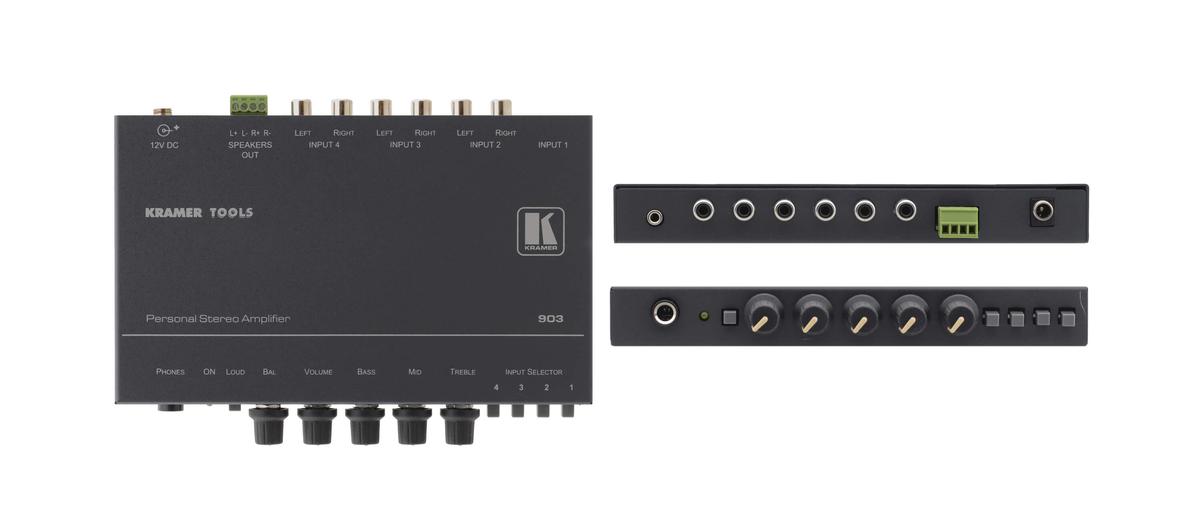 Kramer's 903 is a high-performance Class D integrated personal amplifier for unbalanced stereo audio signals. This device allows for selection between four inputs and delivers a speaker output to 10 watts RMS per channel into a 4 Ohm load. The amplifier features control knobs for volume, bass, mid, treble, balance, and loudness. The 903 is a great device for presentations rooms and multimedia applications, as well as a great addition to any personal audio listening such as a PC or portable CD player. Restaurants, schools, and churches would also be ideal applications for this device where there may be a need to connect 4 audio inputs, to a pair of loud speakers for demos, presentations, or at home events.