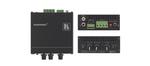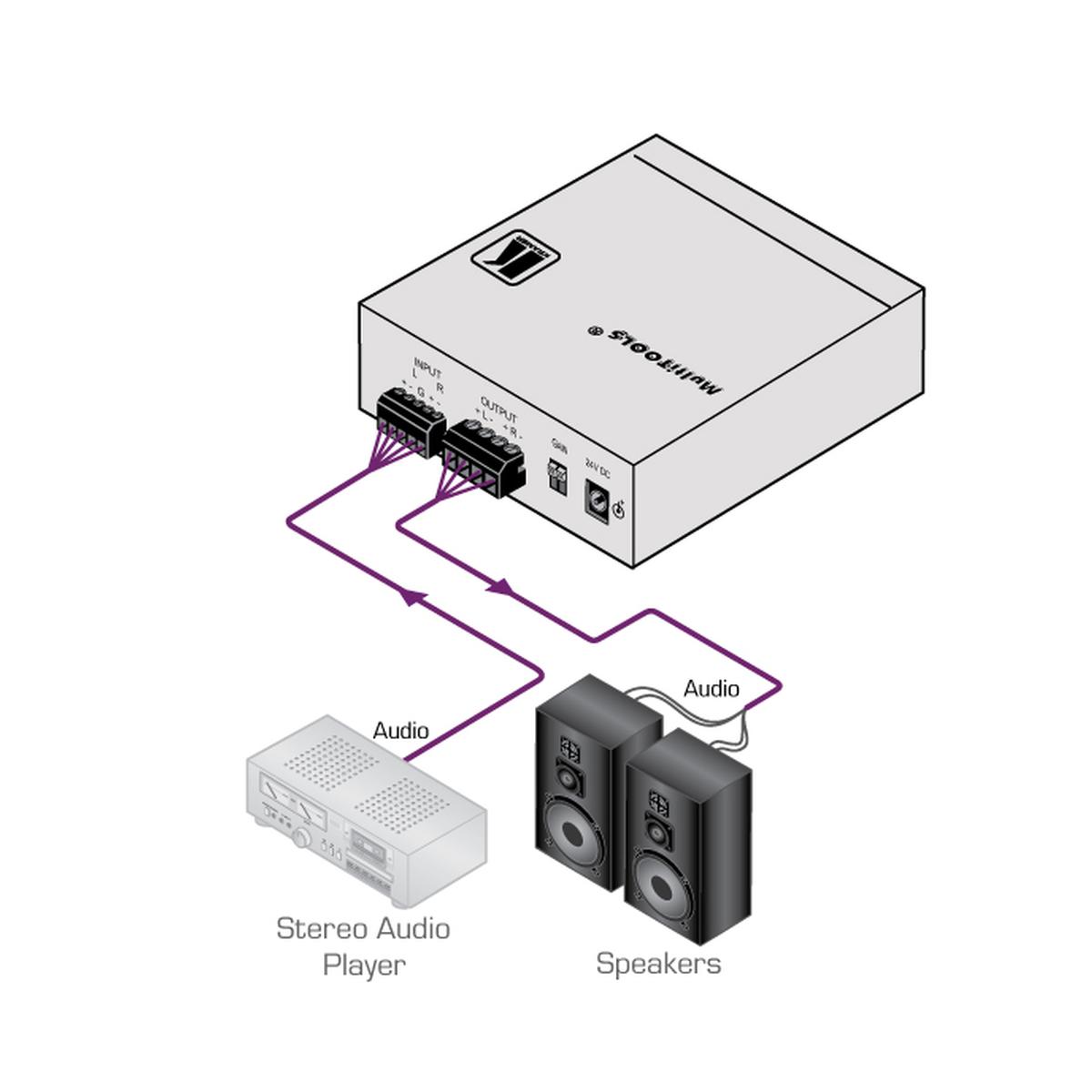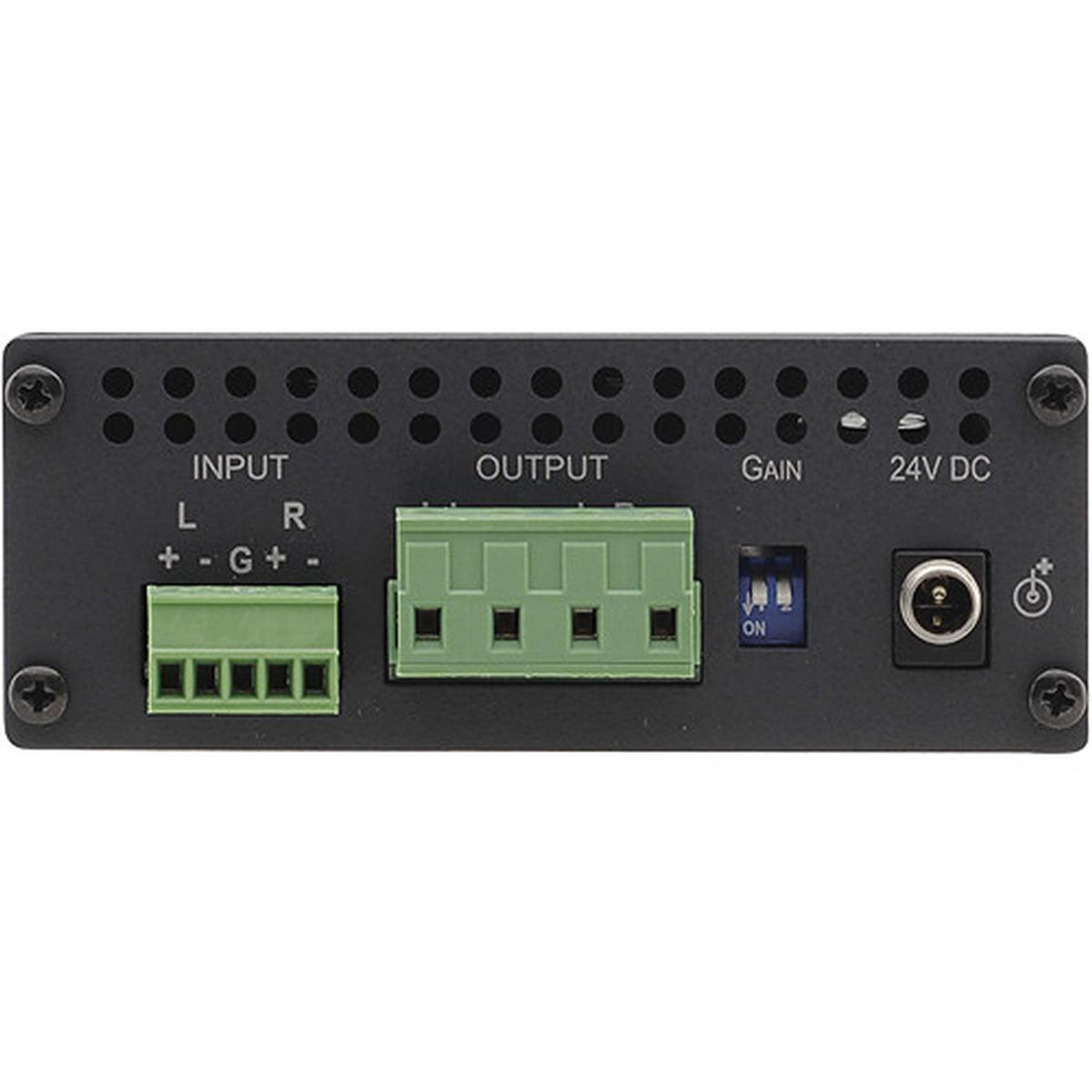 The 907 Stereo Audio Power Amplifier has 1 balanced stereo audio input, and 1 balanced stereo audio (speakers) output, both on terminal block connectors. This unit has a output power of 40 watts per channel into 8Ω, and 150W per channel into 8Ω for output music power. Comes with included power supply and is backed by Kramer's 7 year warranty.