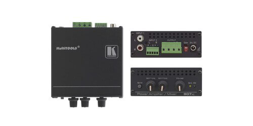The 907xl from Kramer is a high-end power amplifier/mixer for line-level stereo audio signals. This device will accept a balanced stereo audio signal on a terminal block connector and an unbalanced stereo signal on RCA connectors. It delivers 40 watts per channel in to an 8Ω load. With a high-efficiency class D operation, the 907xl has standard features and controls, including 2 Gain Control Dip-Switch, volume control and mute button for each input, as well as mute and "On" LED indicators. This power amplifier is perfect for use in presentation rooms and multimedia applications for quick, local audio amplification as well as personal audio listening.