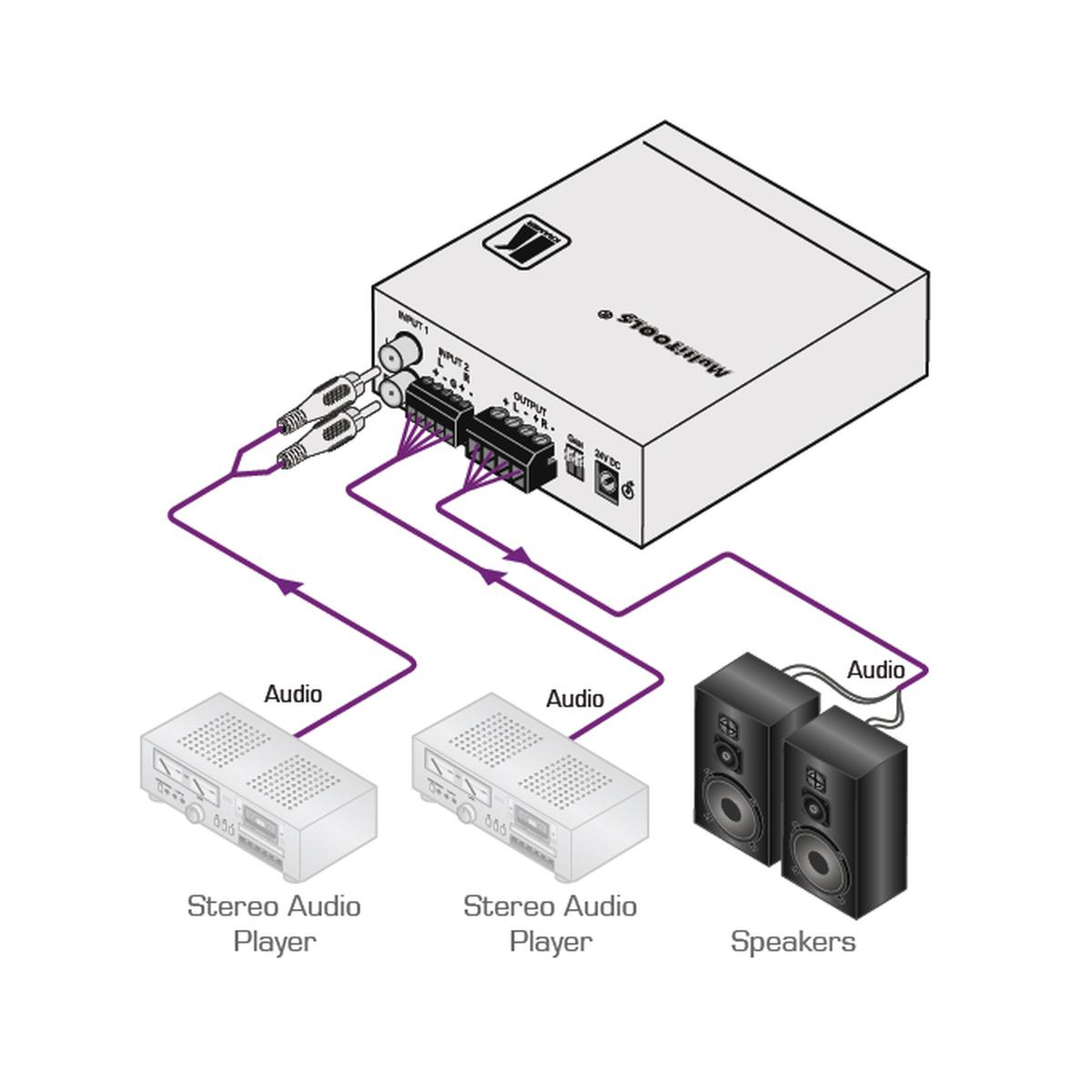 - Input: 1 balanced stereo audio on a terminal block connector, 1 unbalanced stereo audio on RCA connector