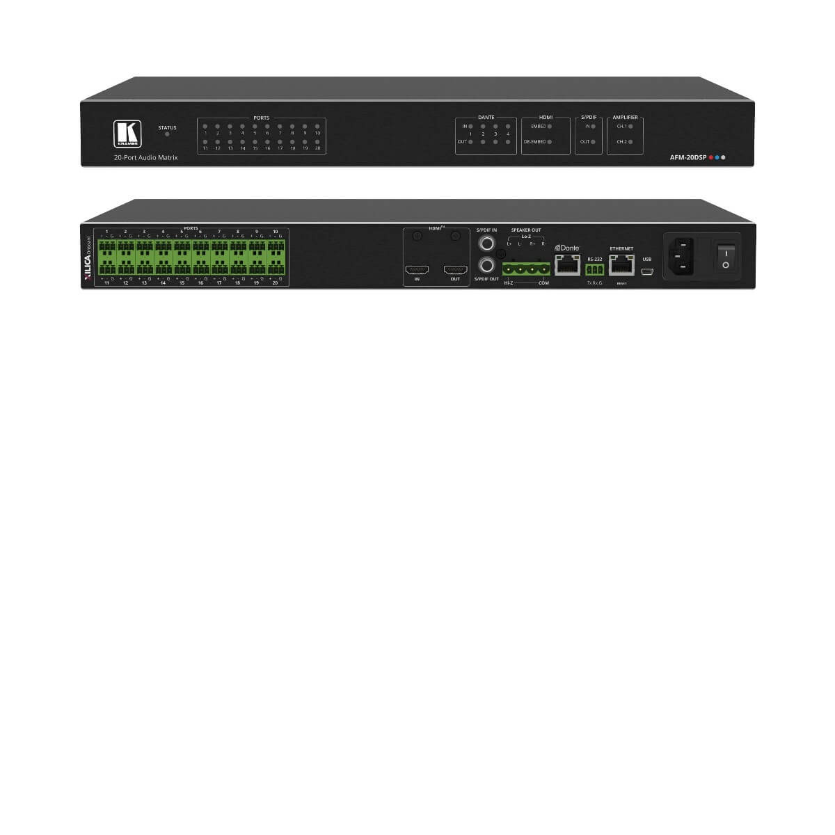 AFM-20DSP is a member of the Kramer XSPerience family of DSP products. AFM-20DSP is an advanced, professional audio matrix switcher with 20 analog ports that can be configured as inputs or outputs according to preset I/O configurations.