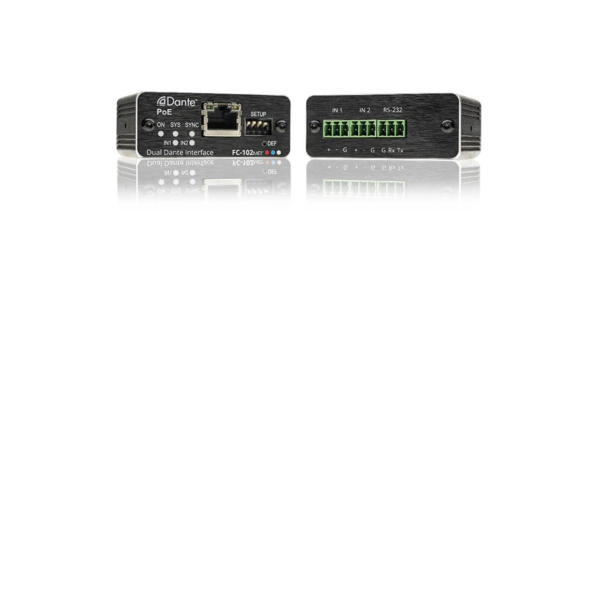 FC-102Net is a compact 2-channel Dante encoder with 2 balanced mono audio inputs that enables connecting non-Dante sources, such as microphones, laptops and players to a Dante network. It supports line level and microphone level sources and can provide 48V phantom power per input. FC-102Net is powered over Ethernet from any standard PoE providing network switch.